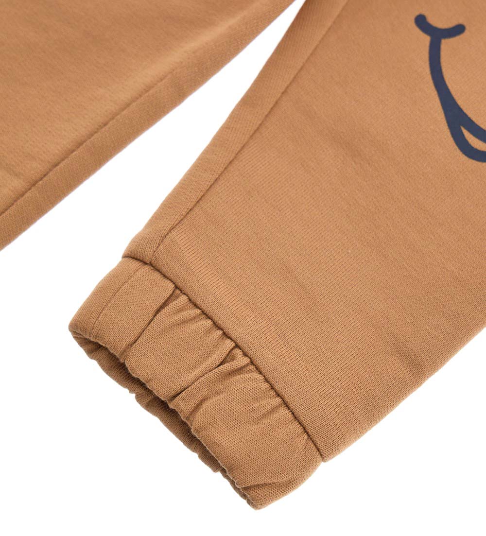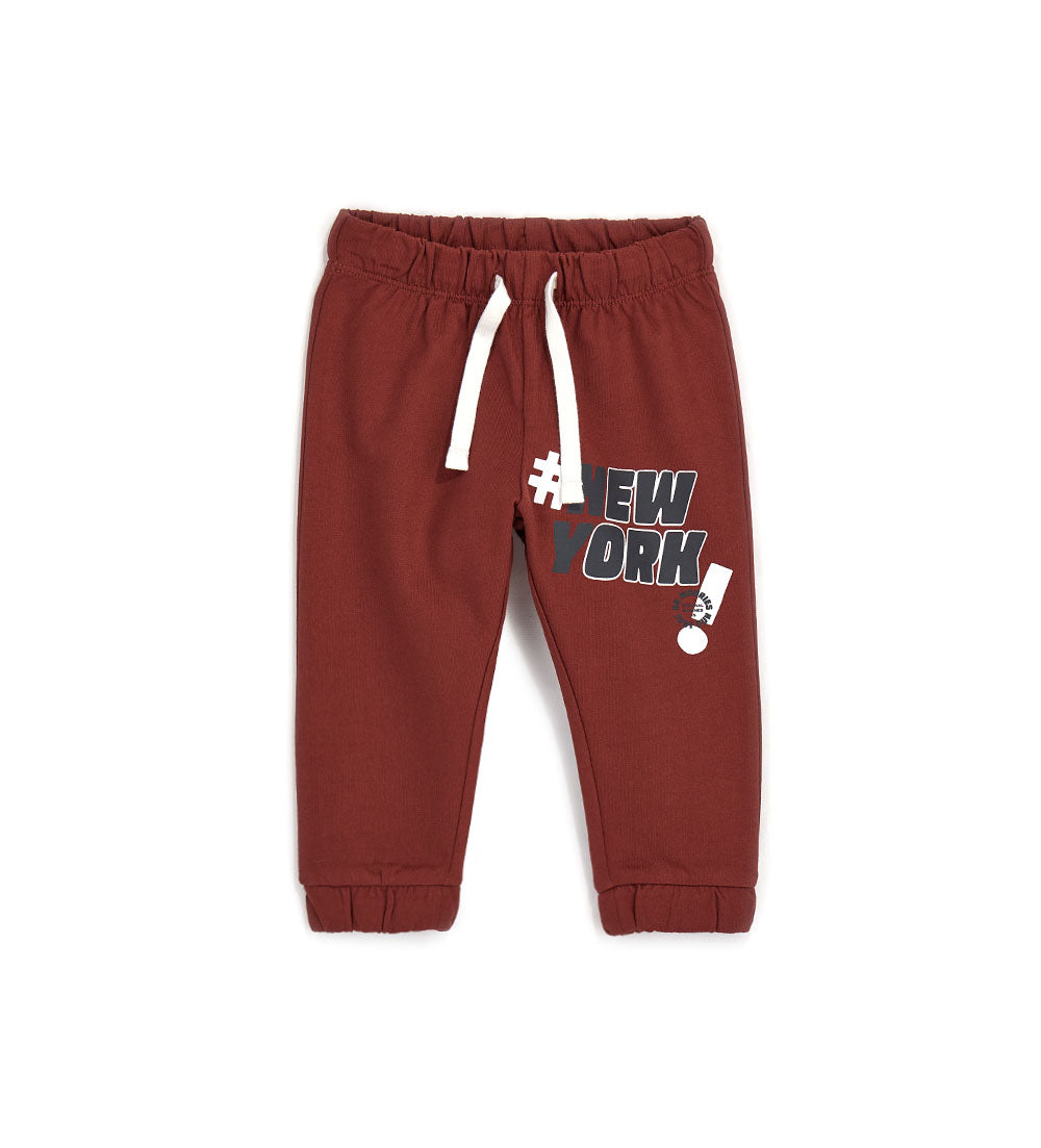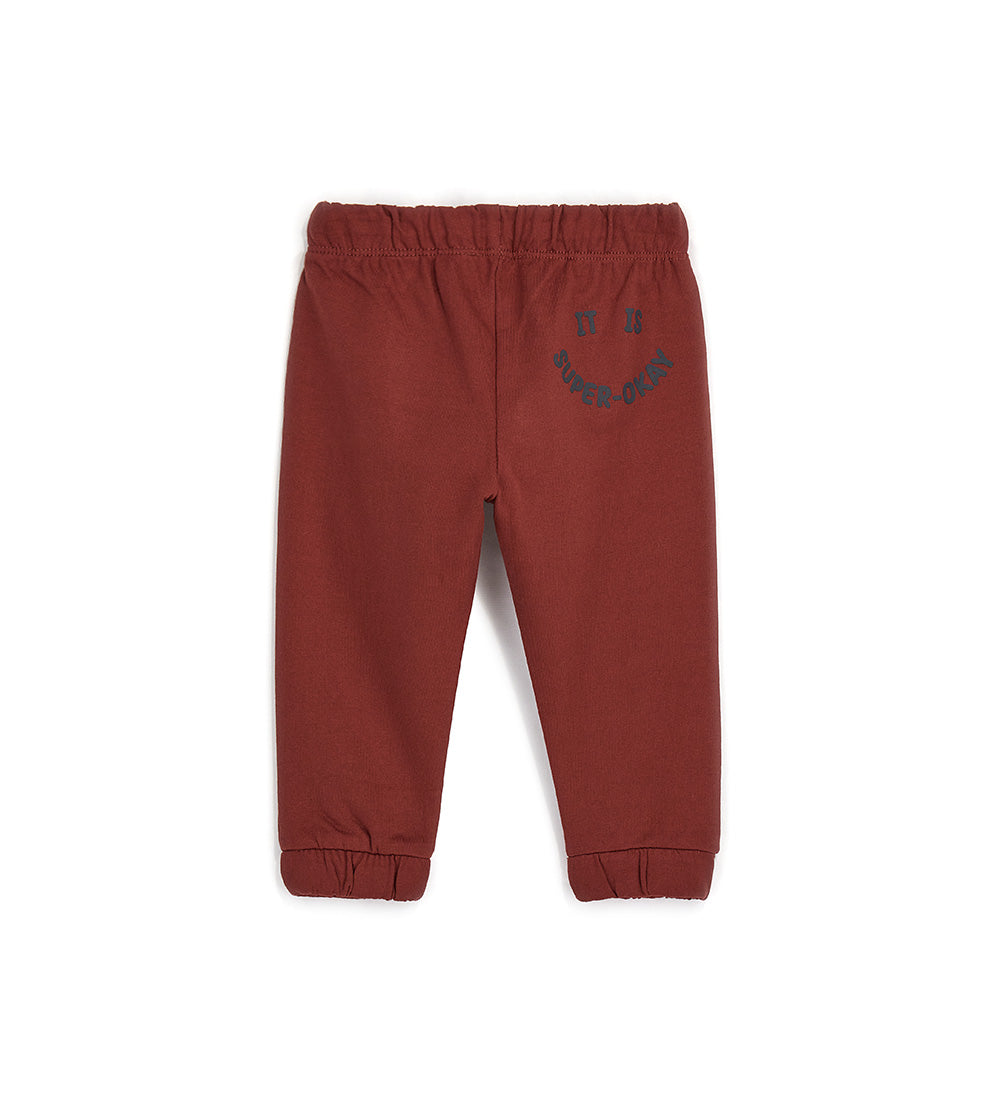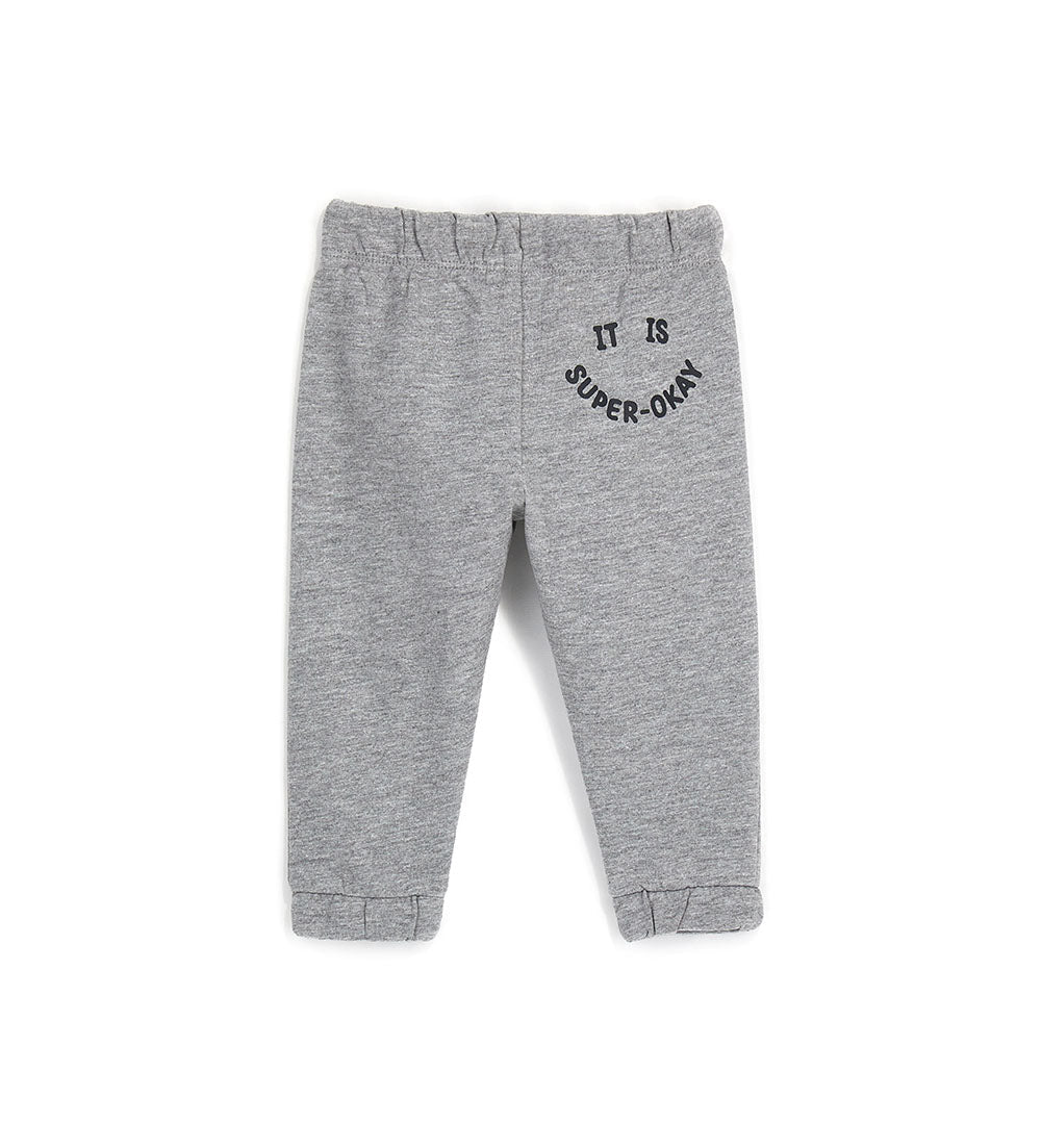 Cotton fleeced pants with elasticated waist and hem, drawstring waist and front and back prints.