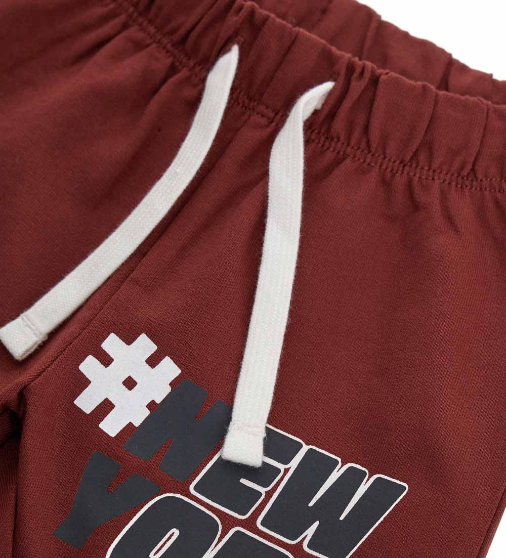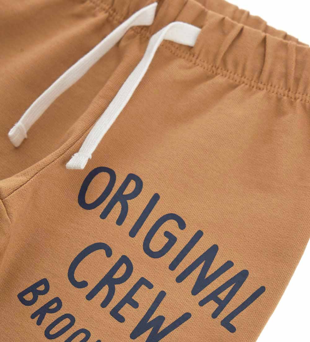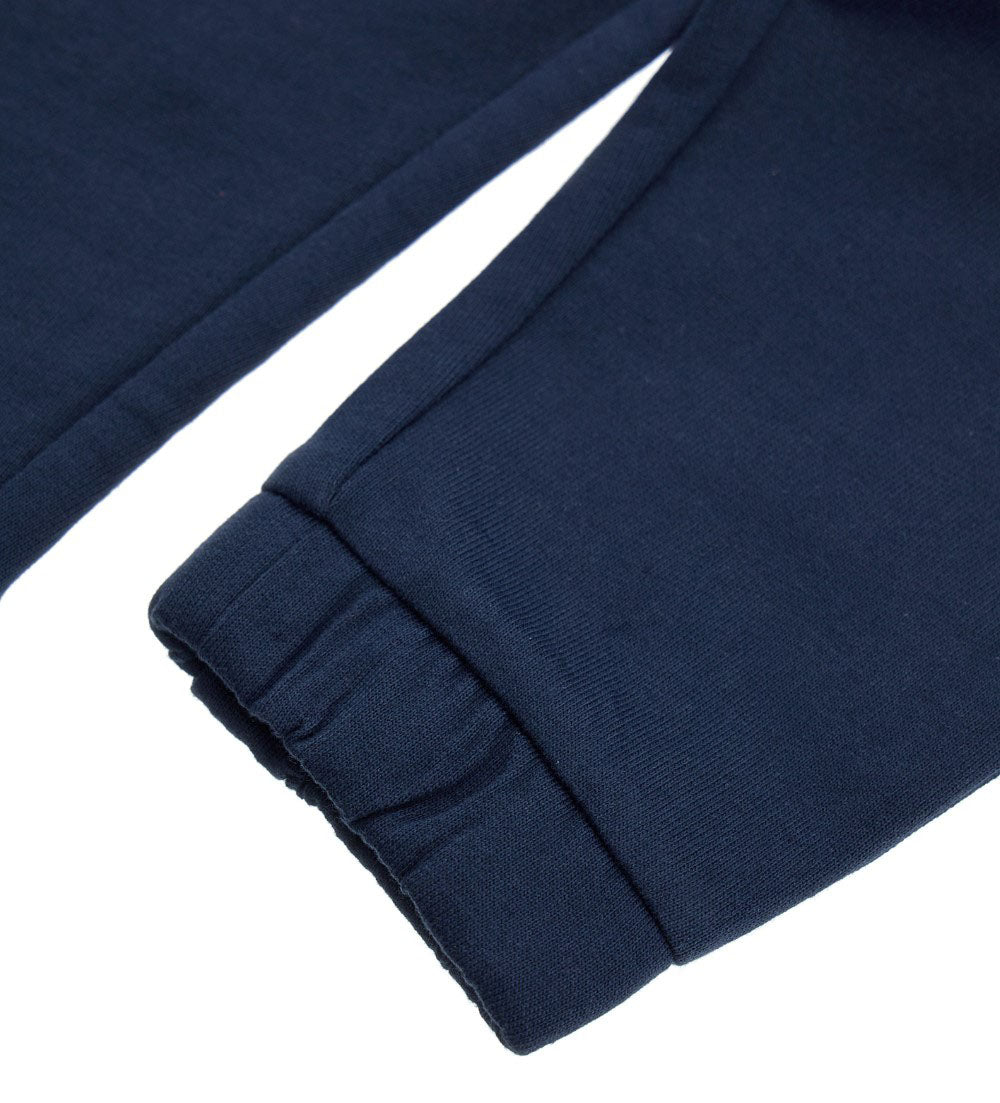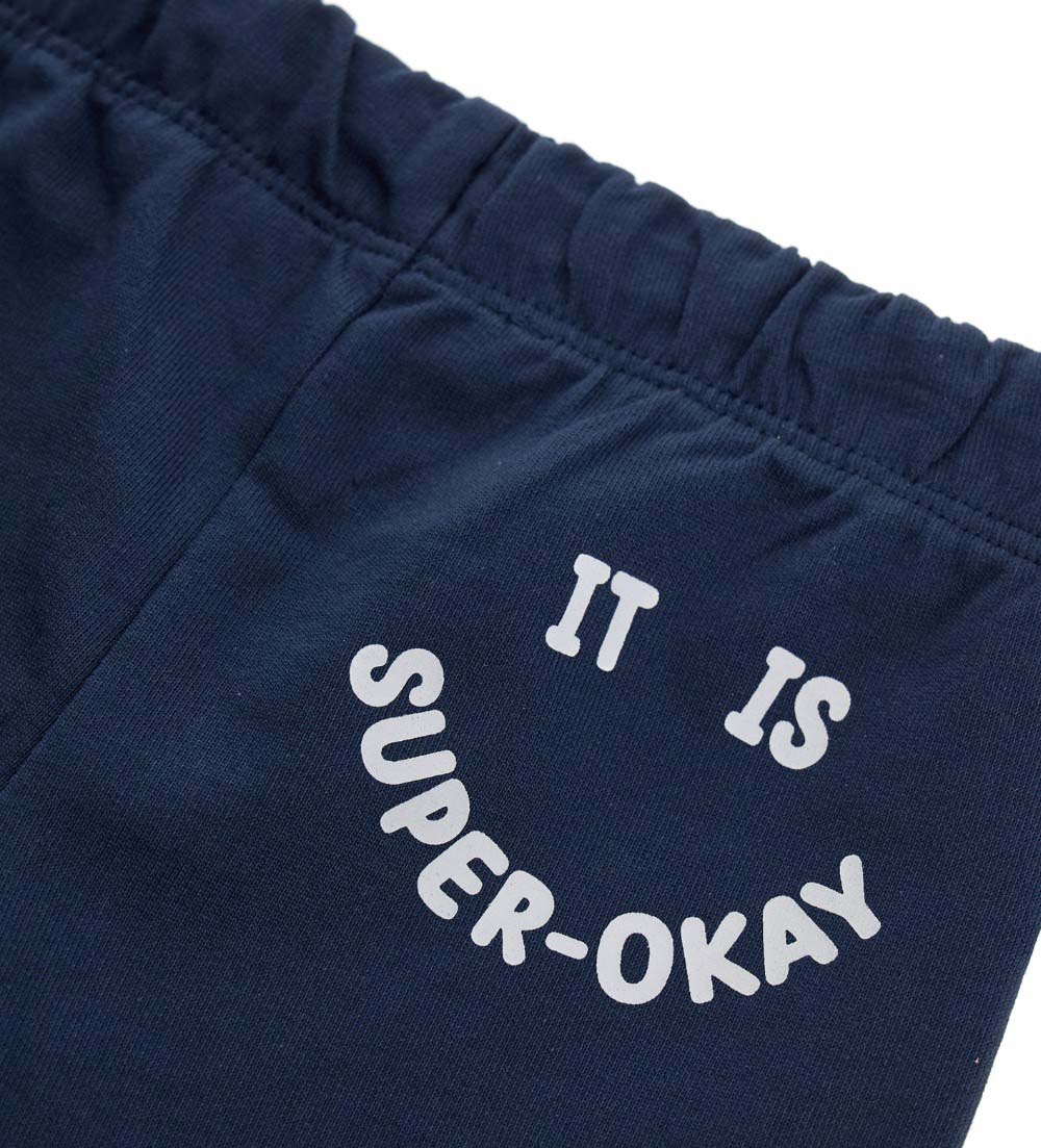 Cotton fleeced pants with elasticated waist and hem, drawstring waist and front and back prints.