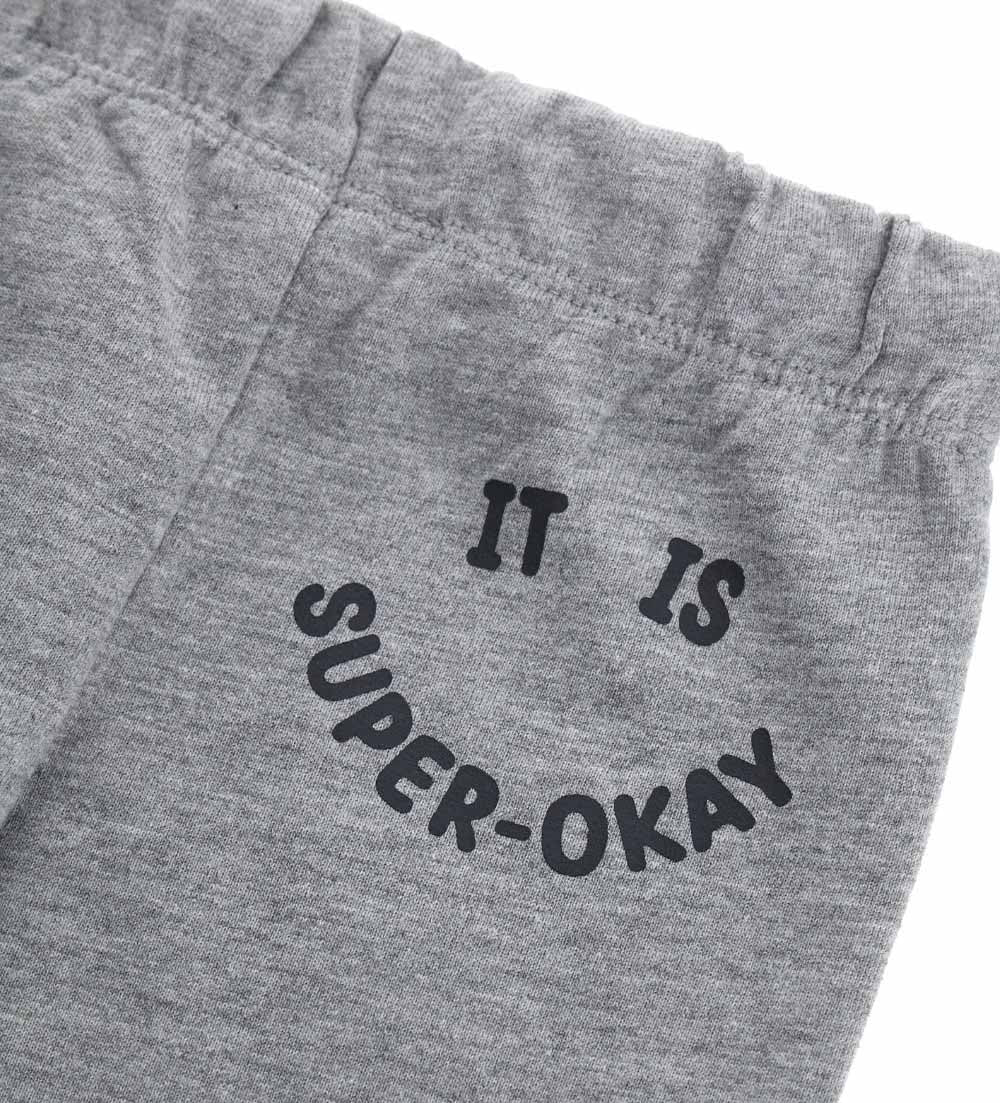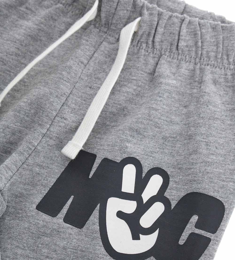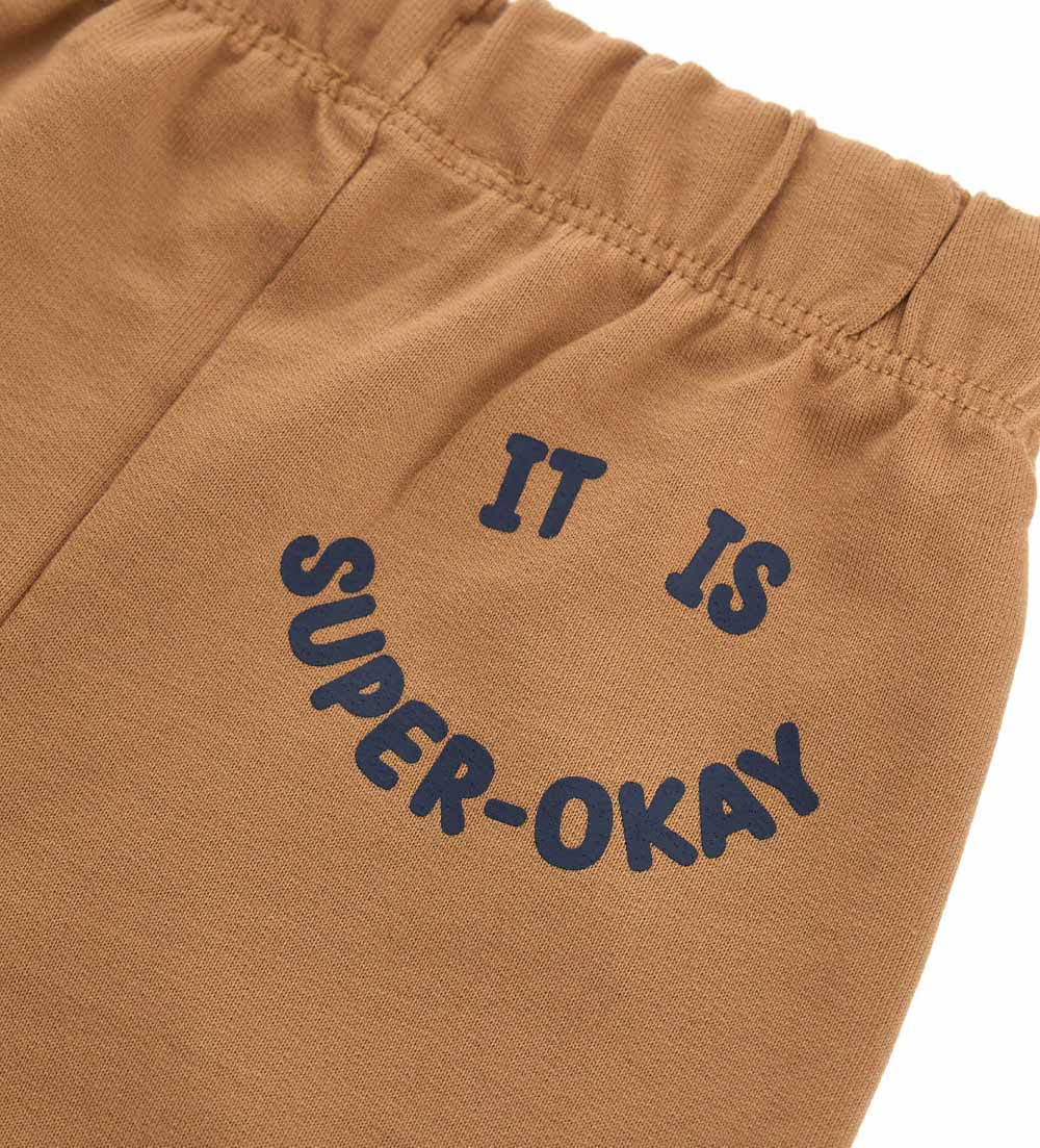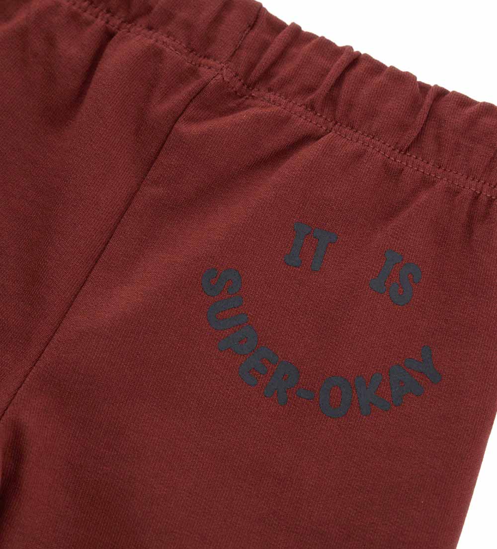 Cotton fleeced pants with elasticated waist and hem, drawstring waist and front and back prints.
