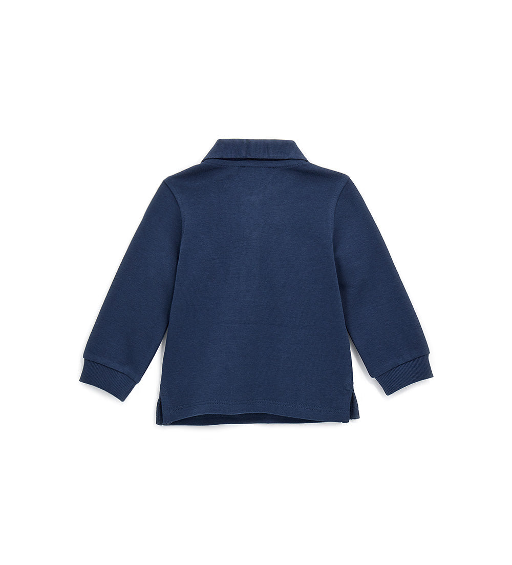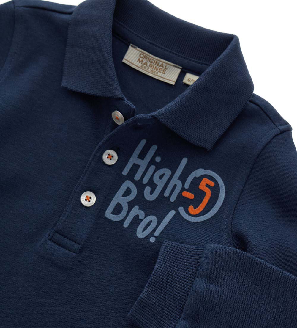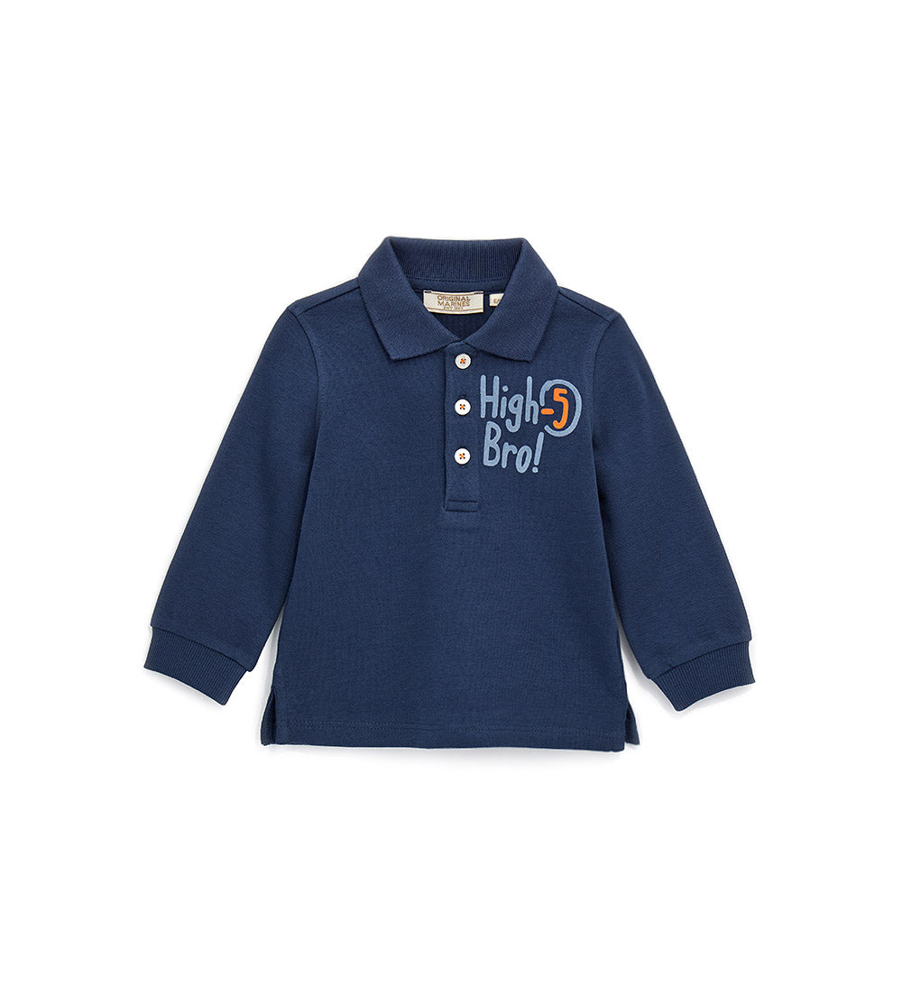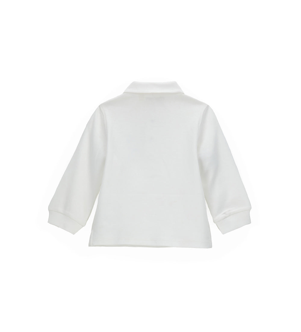 Long-sleeved cotton polo shirt, front opening with buttons, ribbed finishes, side vents and front print.