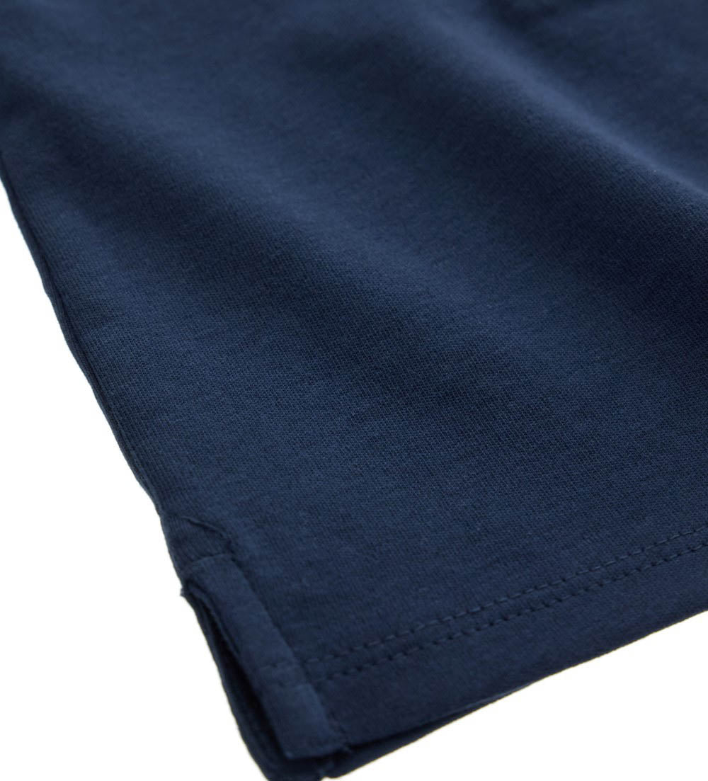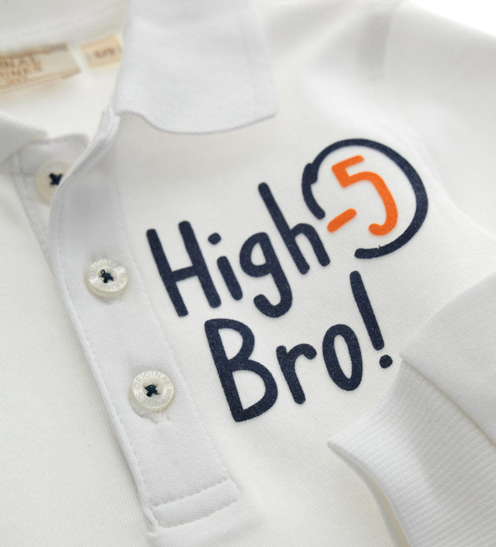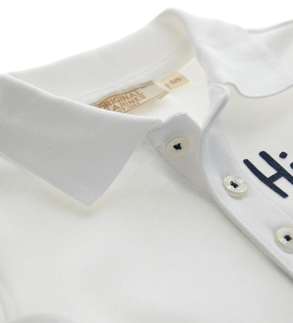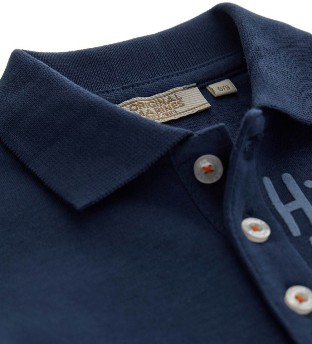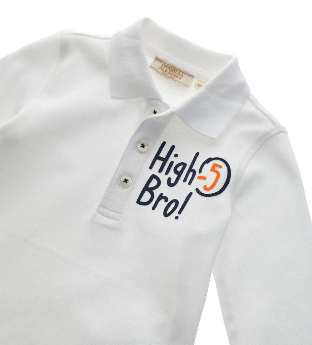 Long-sleeved cotton polo shirt, front opening with buttons, ribbed finishes, side vents and front print.