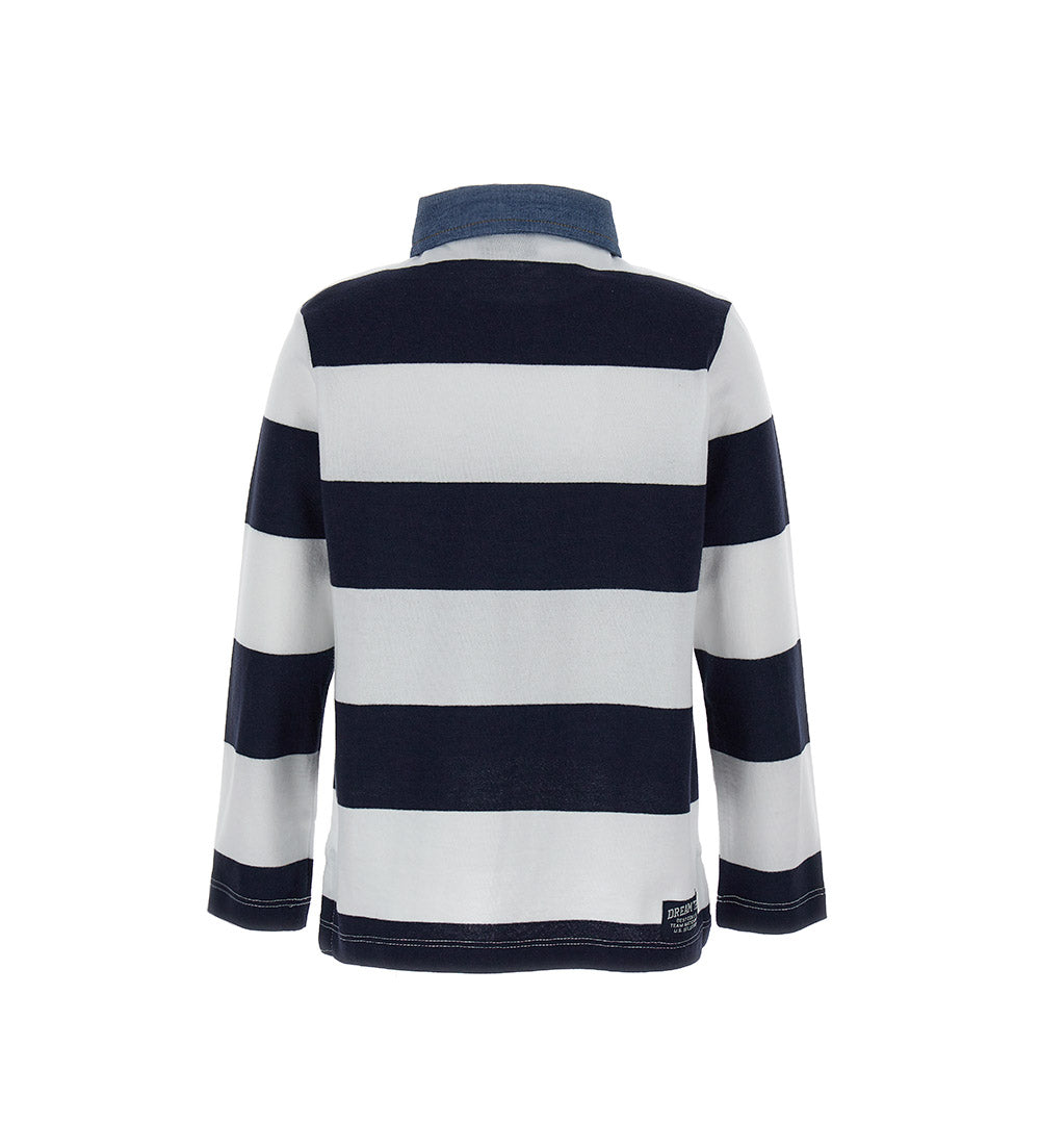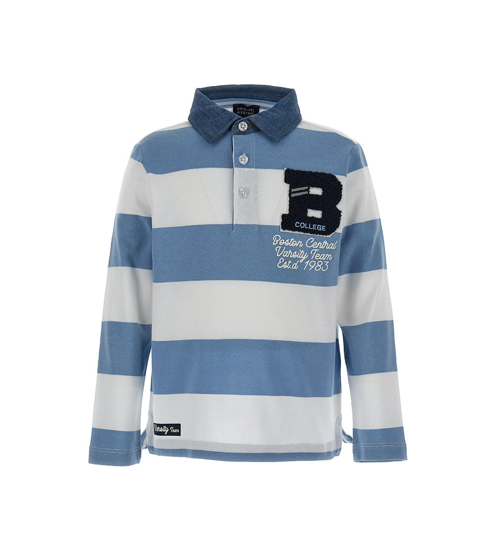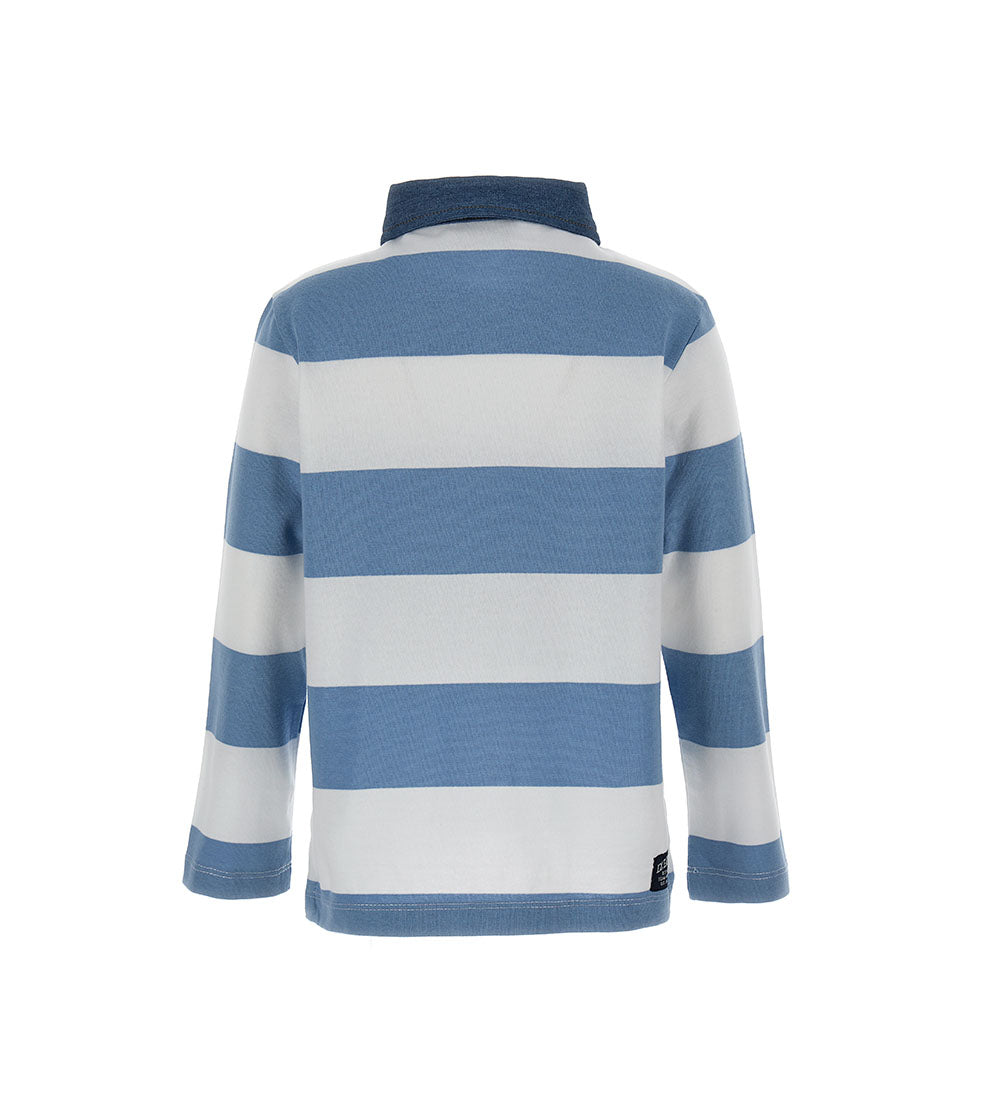 Yarn-dyed cotton polo shirt with long sleeves, denim cotton collar, front opening with buttons, tonal stitching thread, print, embroidery and embroidered label on the back.