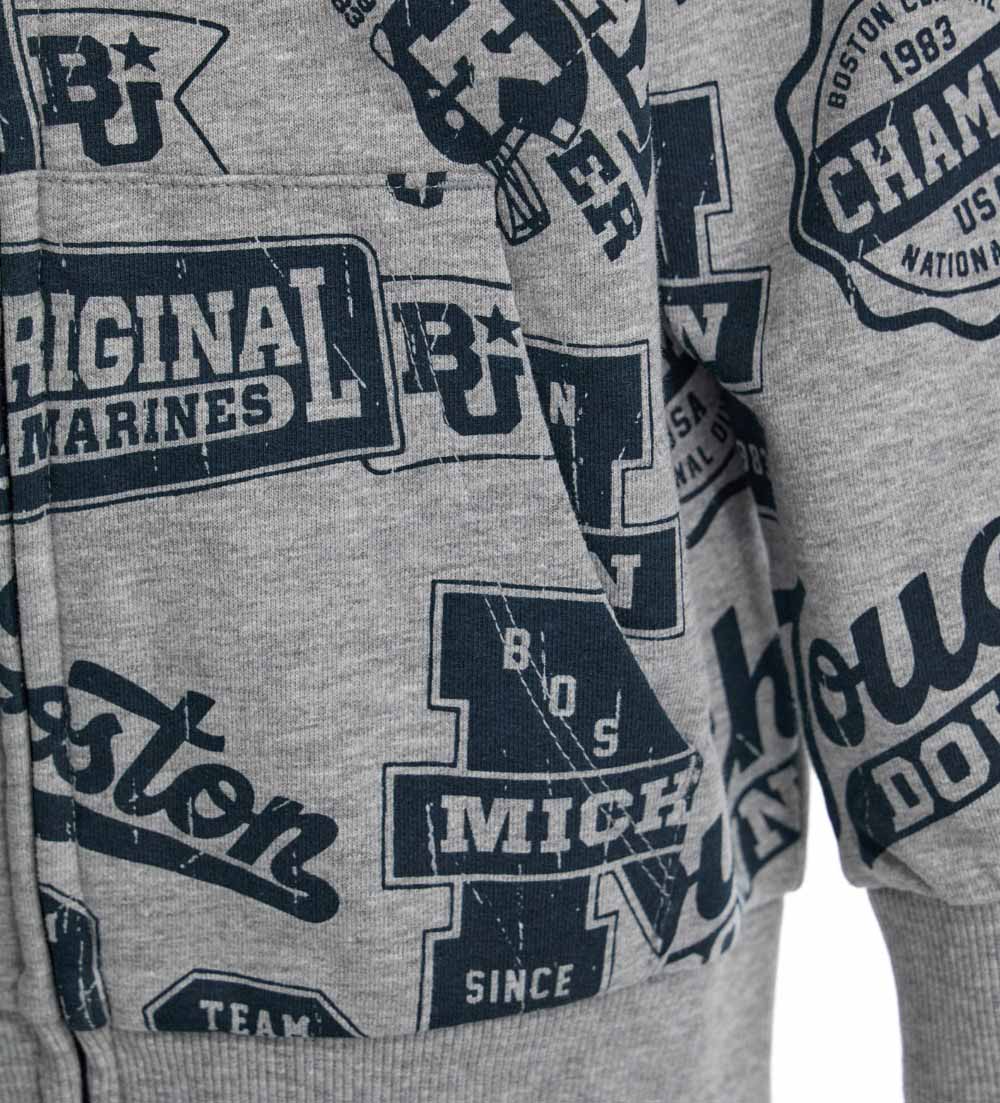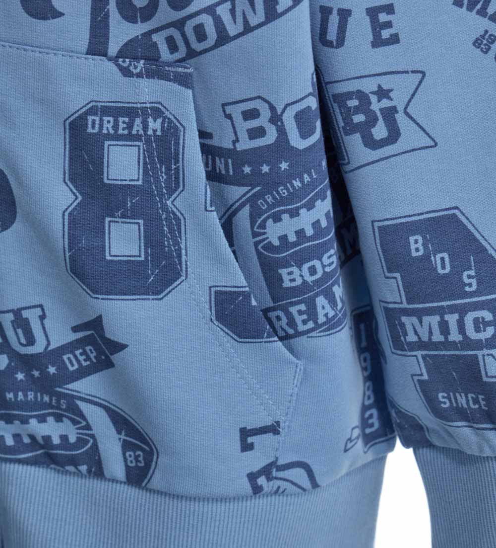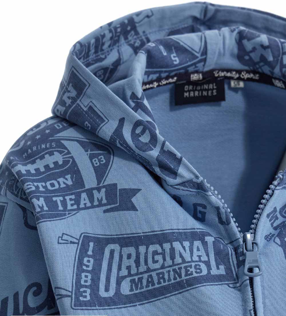 Allover printed long-sleeved cotton hoodie with cotton-lined hood, hidden zip opening, ribbed finishes, kangaroo pocket and front side embroidered label.