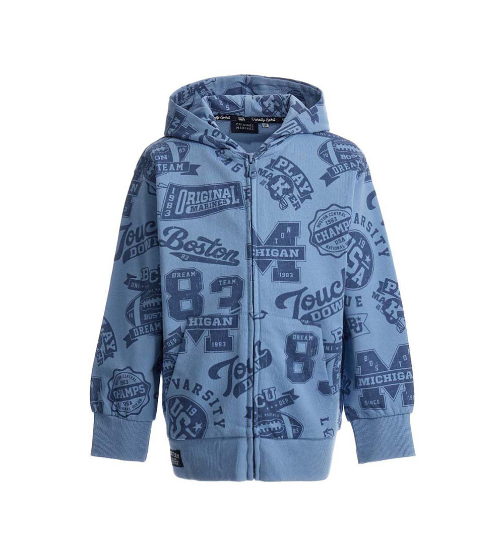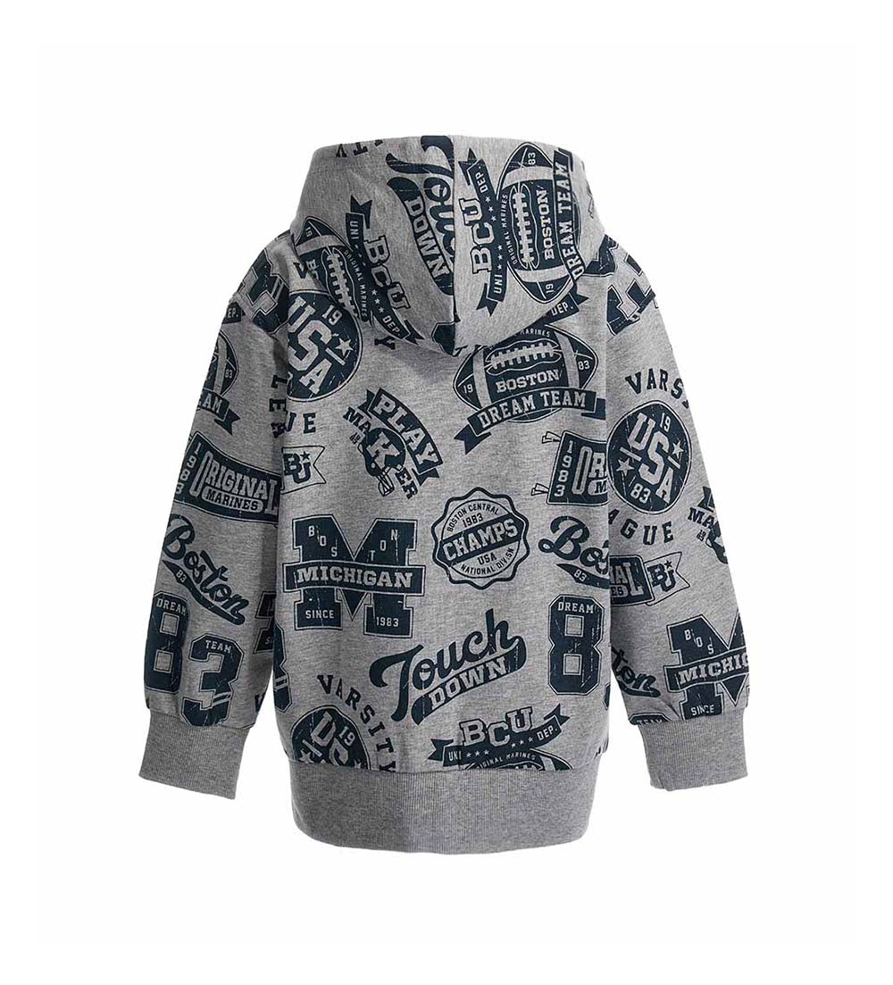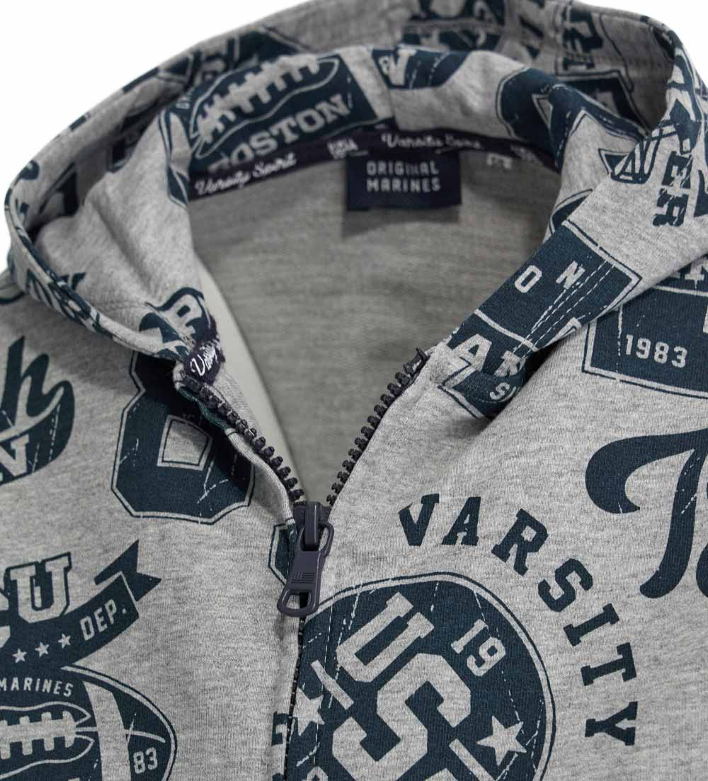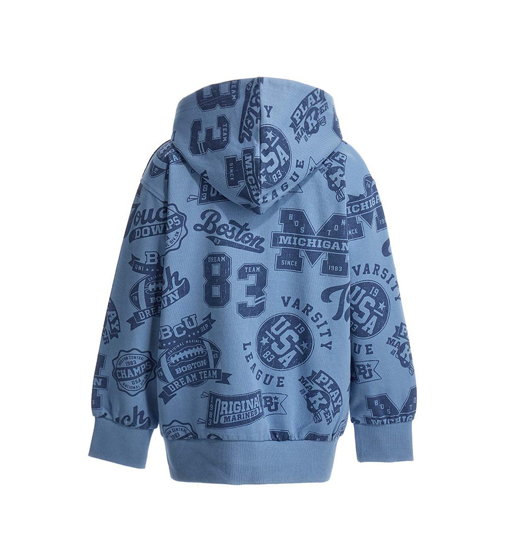 Allover printed long-sleeved cotton hoodie with cotton-lined hood, hidden zip opening, ribbed finishes, kangaroo pocket and front side embroidered label.