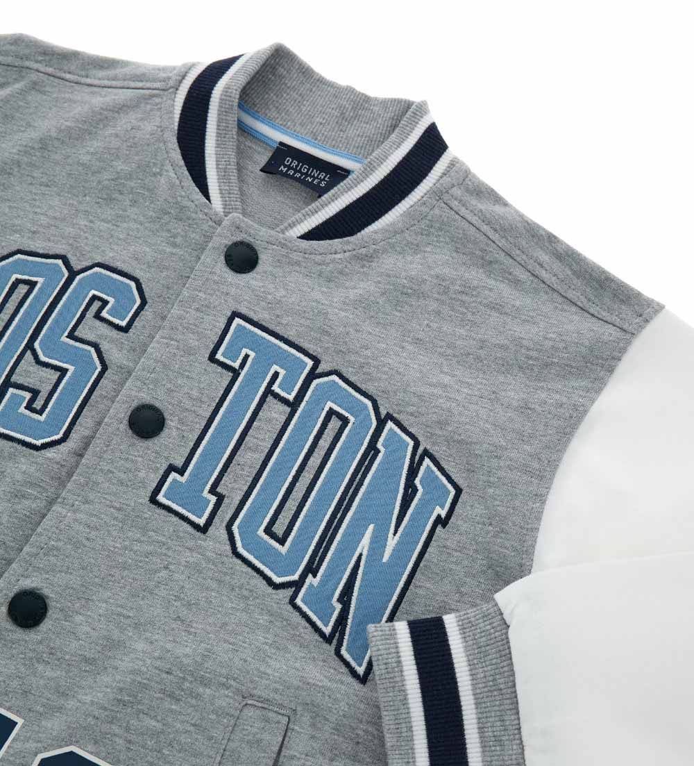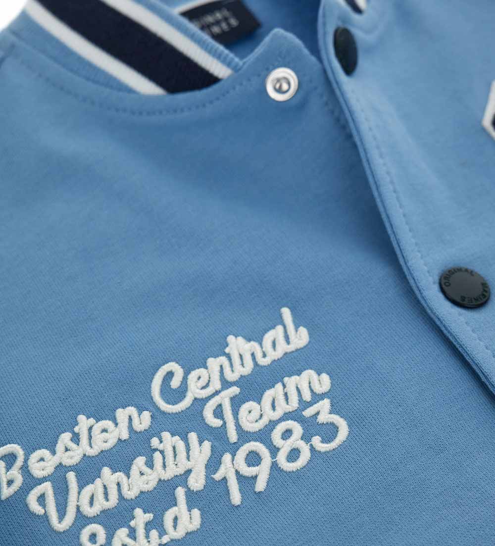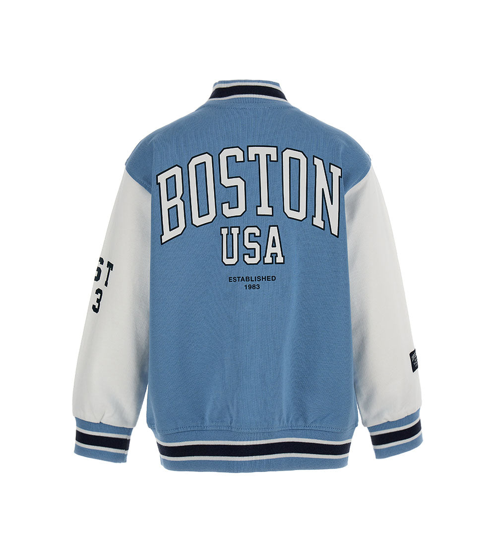 Cotton bomber jacket with contrasting long sleeves, yarn-dyed ribbed finishes, welt pockets, contrasting snap buttons, prints, embroidery and embroidered label on the sleeve.