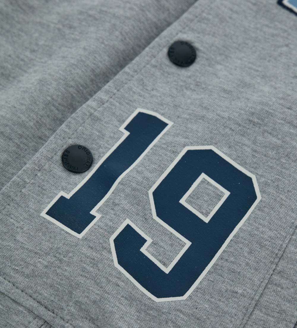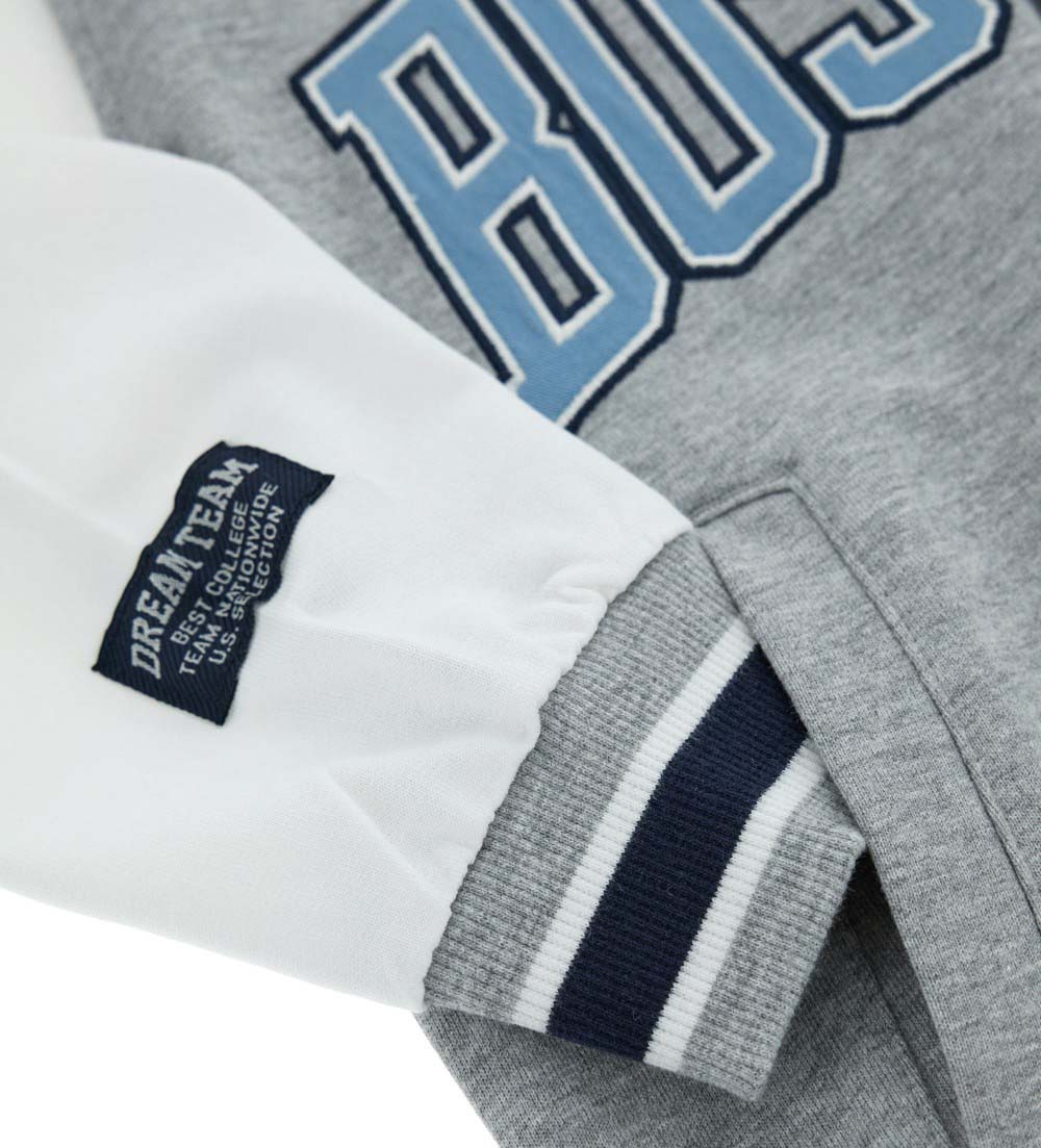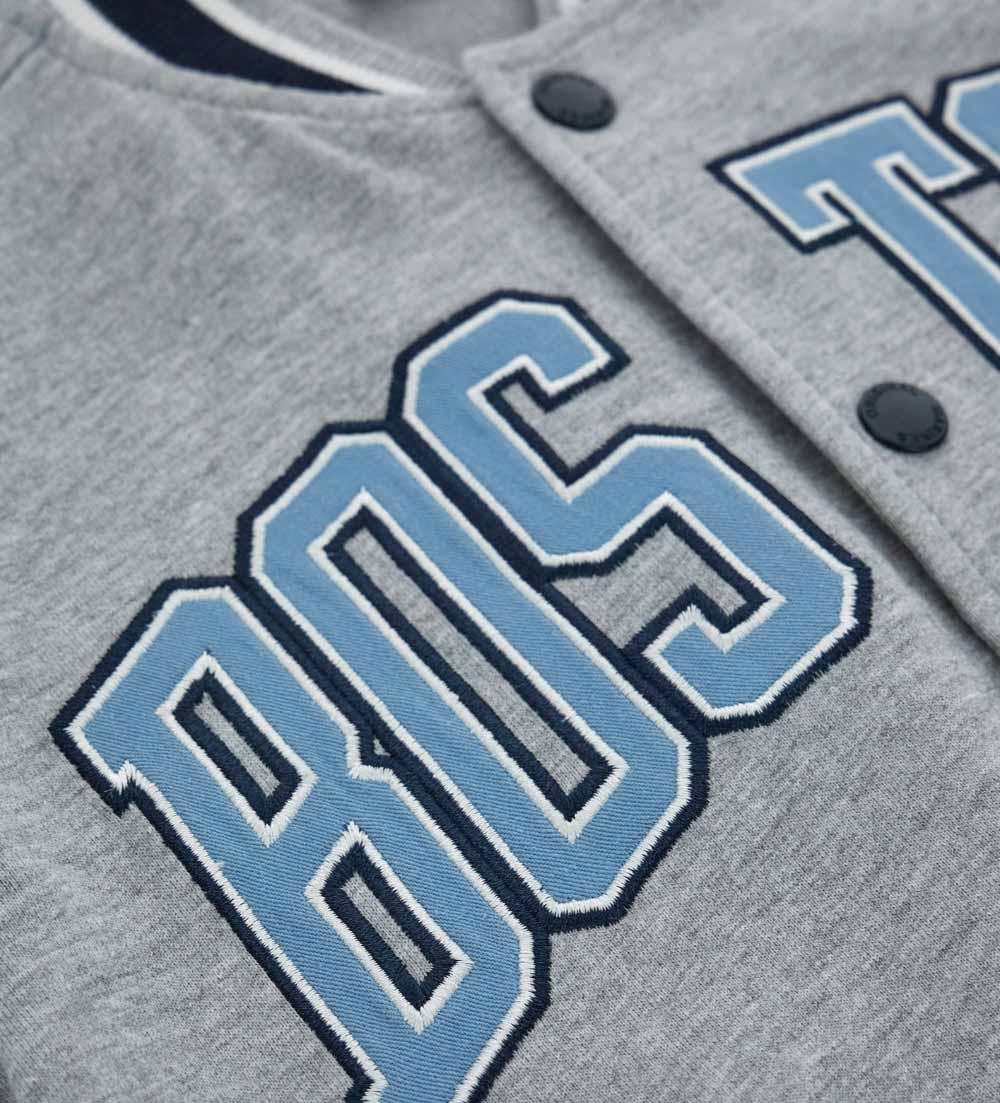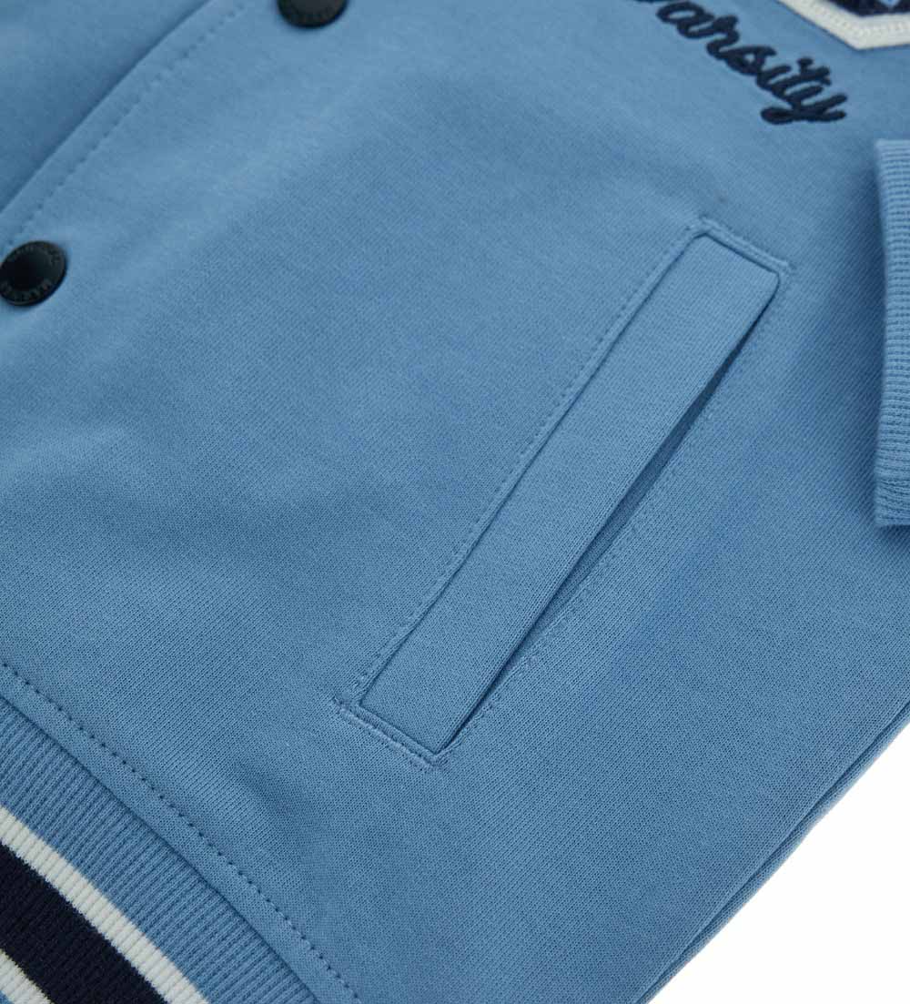 Cotton bomber jacket with contrasting long sleeves, yarn-dyed ribbed finishes, welt pockets, contrasting snap buttons, prints, embroidery and embroidered label on the sleeve.