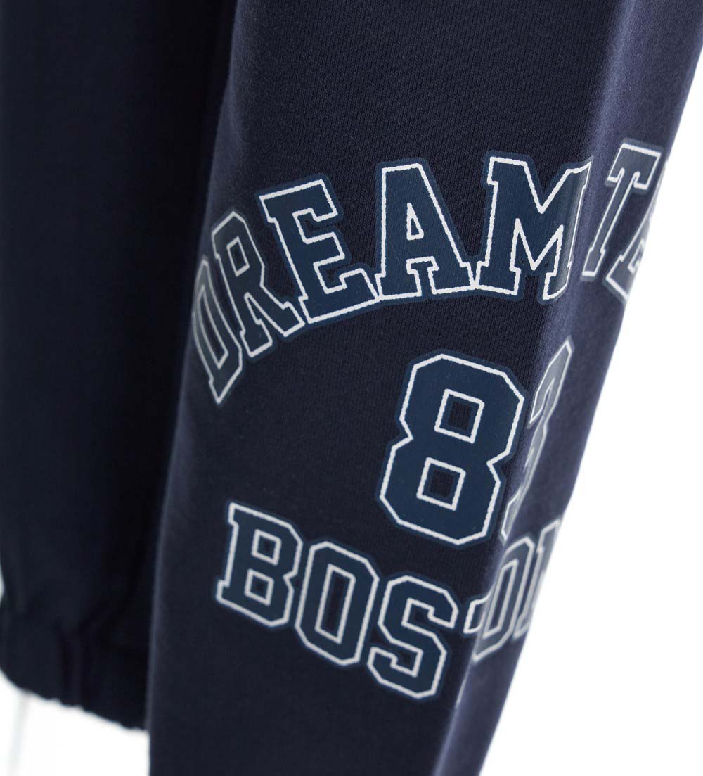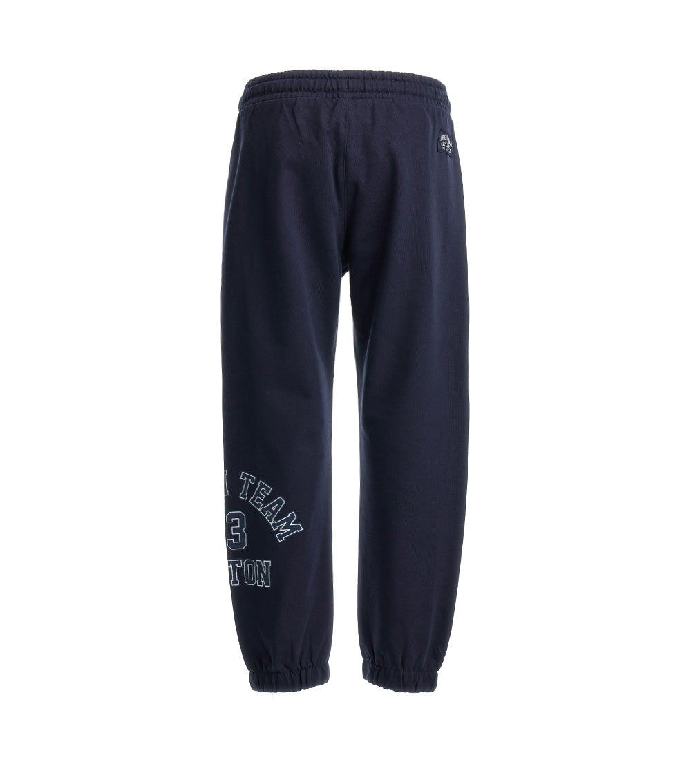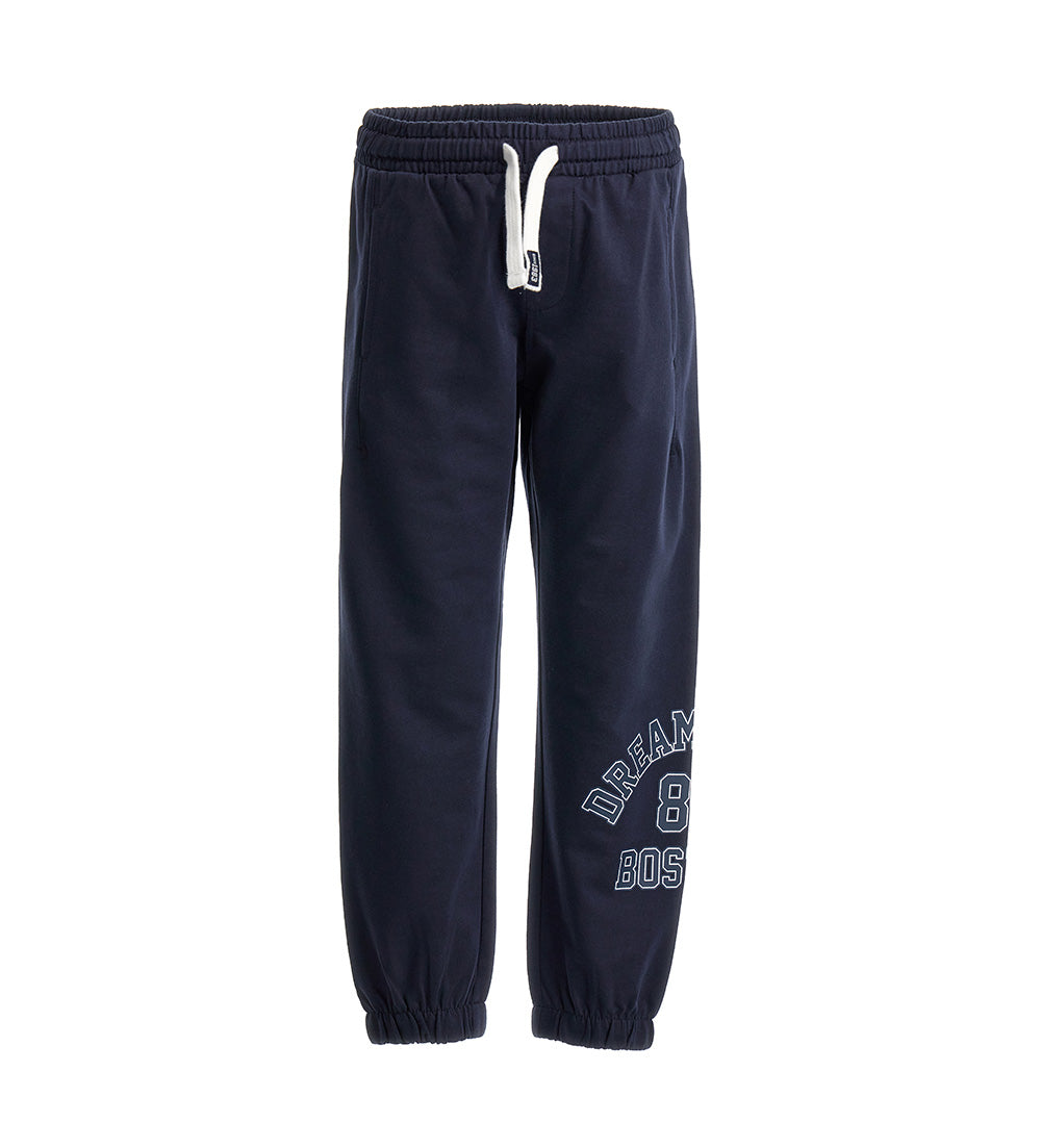 Fleeced cotton pants with hidden pockets in the seam line, contrasting adjustable lace, elastic on the bottom, side print and embroidered label.