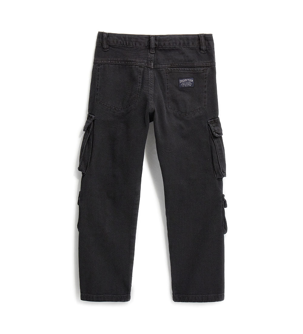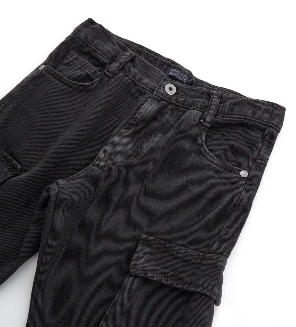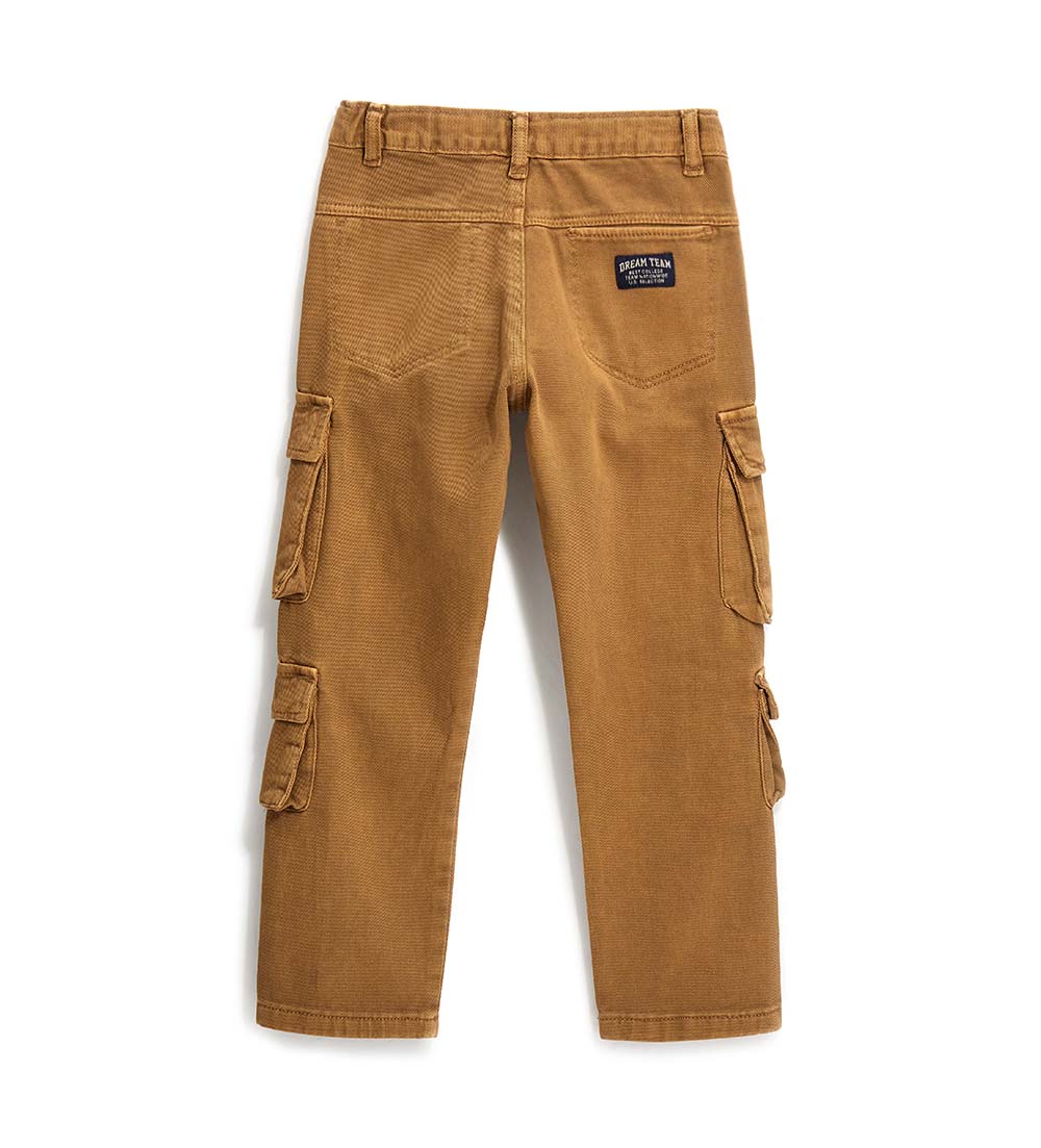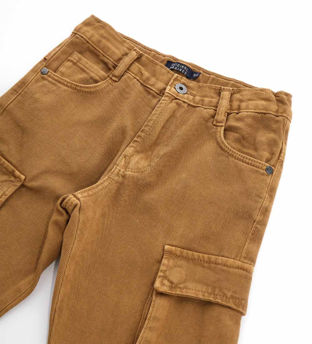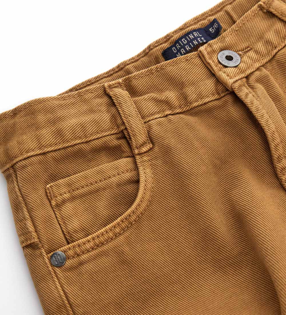 5-pocket cotton pants with zip and button, back pockets hidden in the yoke line, large side pockets, adjustable waist and embroidered label.