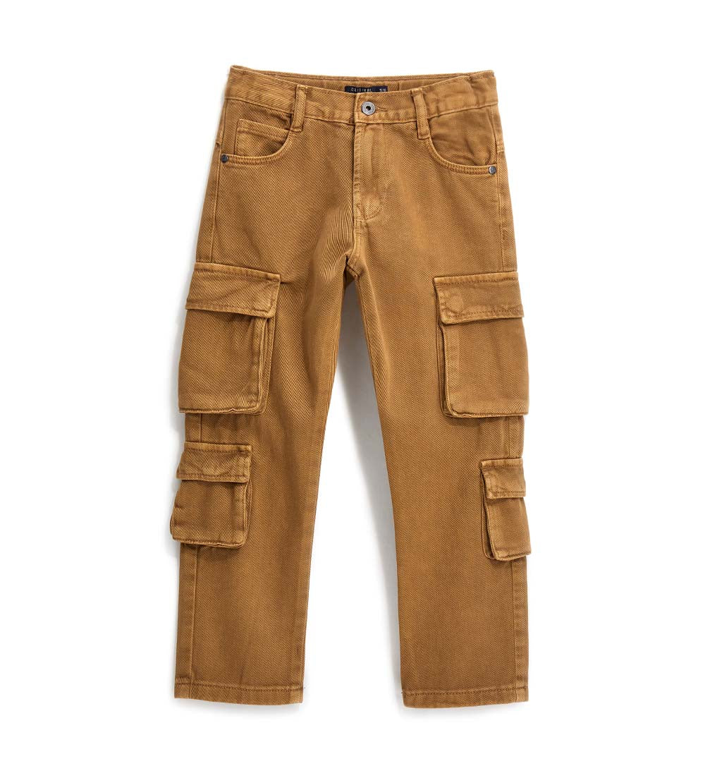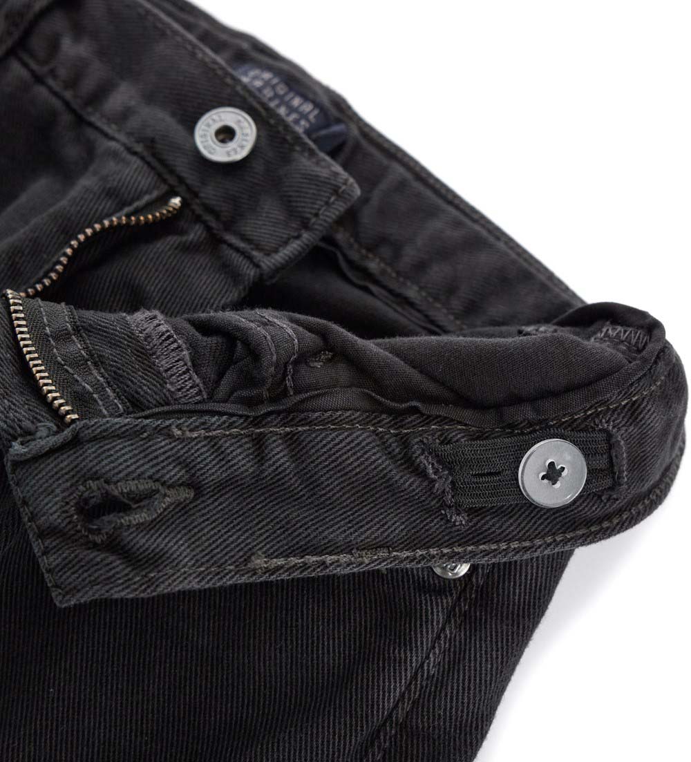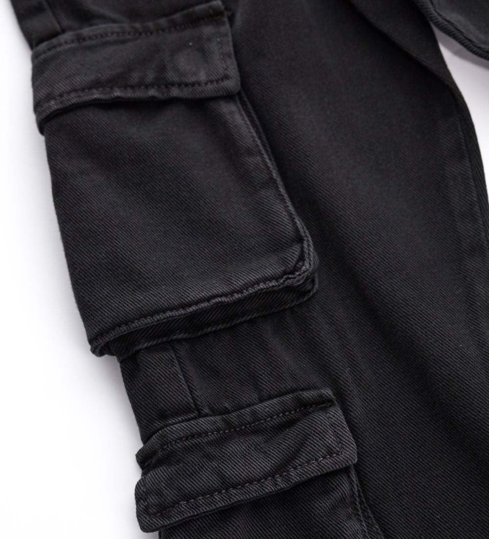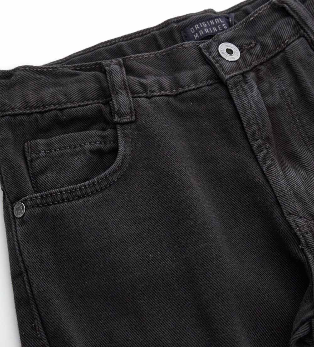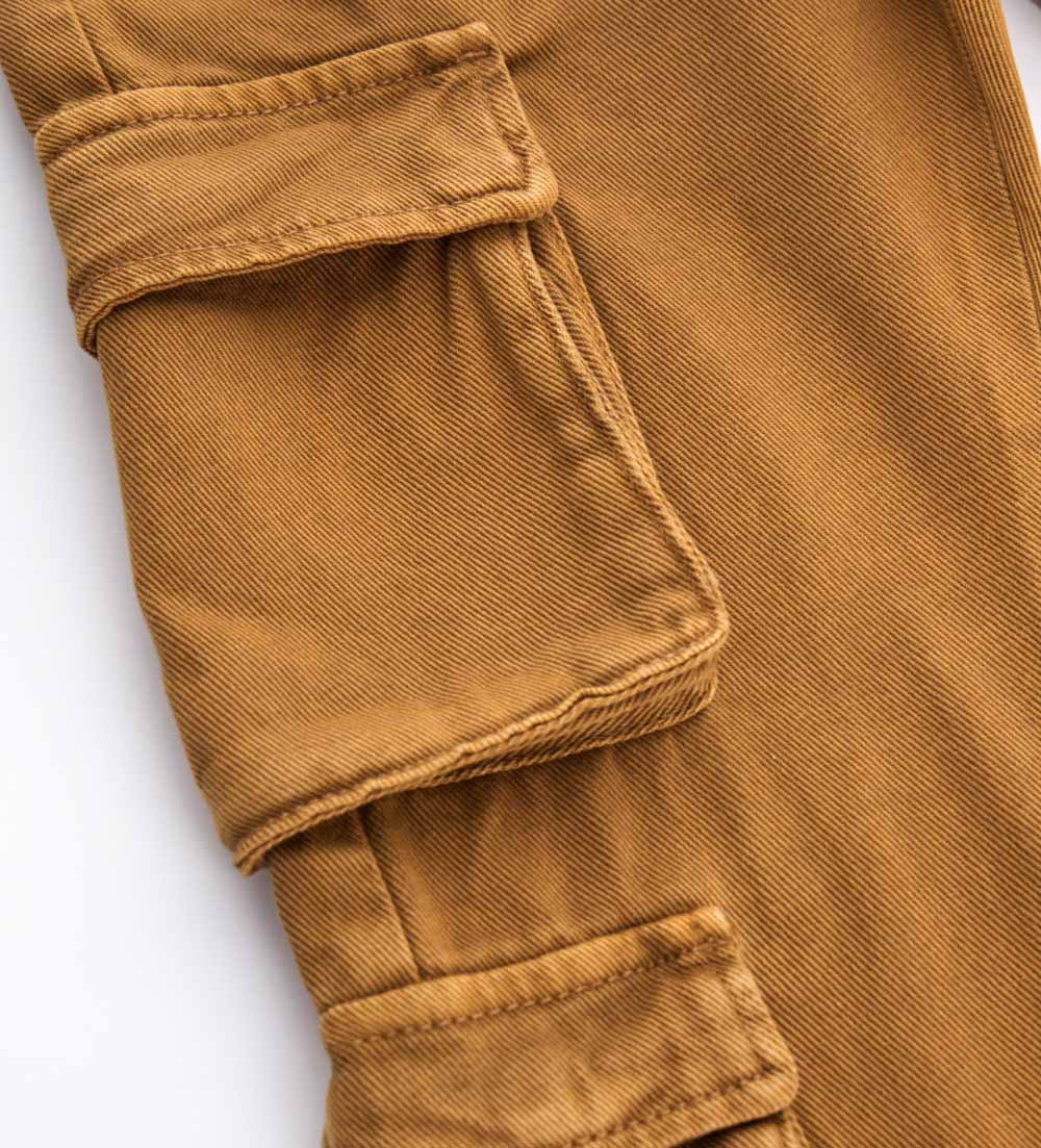 5-pocket cotton pants with zip and button, back pockets hidden in the yoke line, large side pockets, adjustable waist and embroidered label.