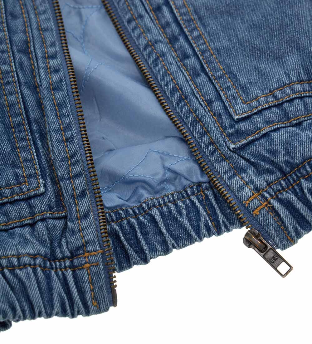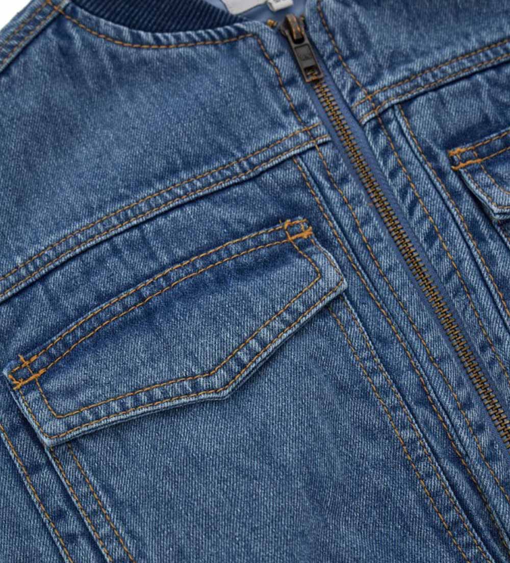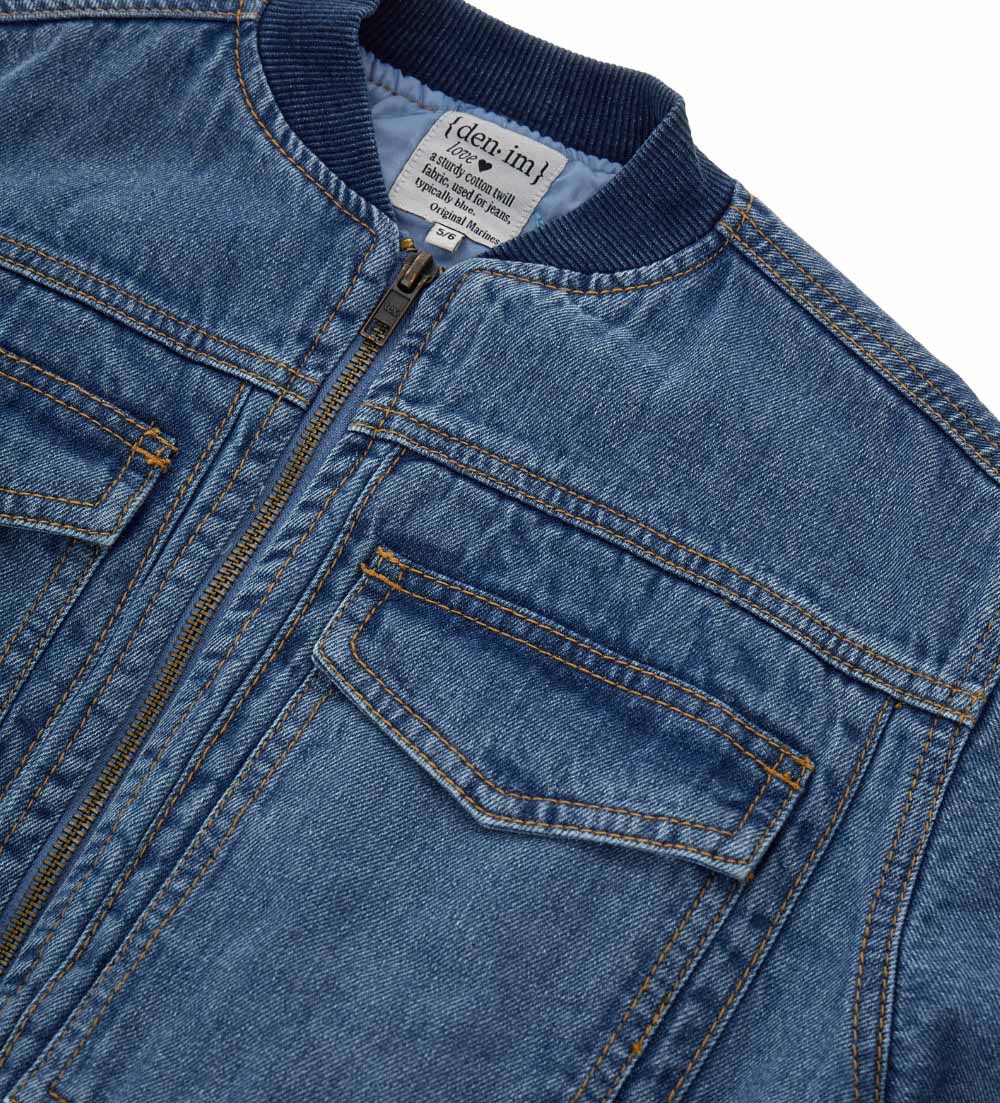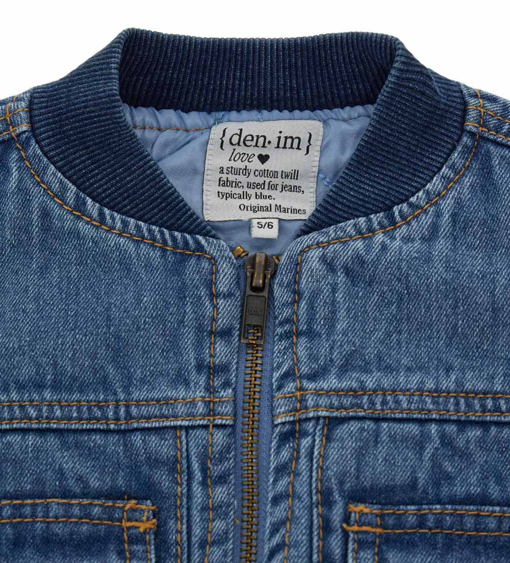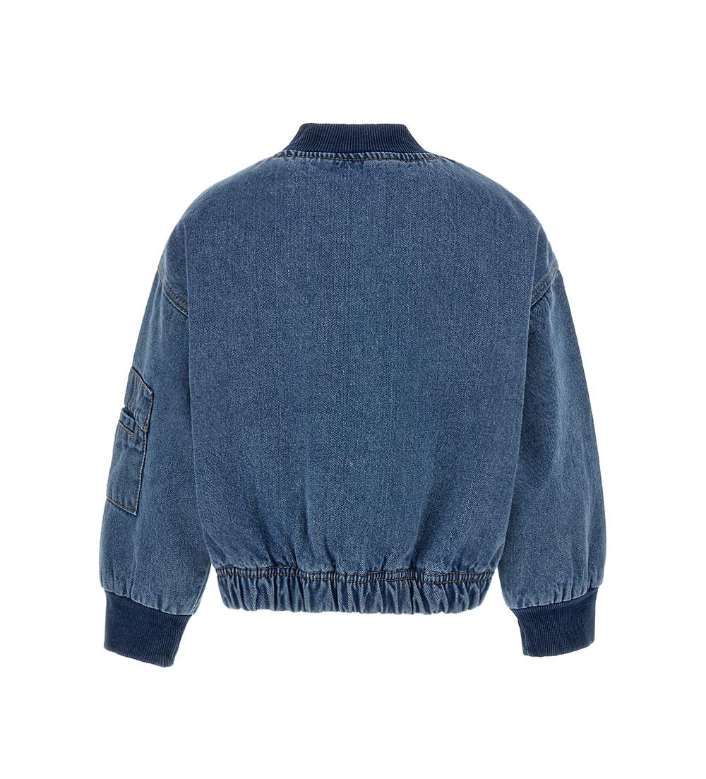 Long-sleeved bomber jacket with elasticated hem, front zip closure, patch pockets with flap on the front, ribbed trims at the neck and cuffs.