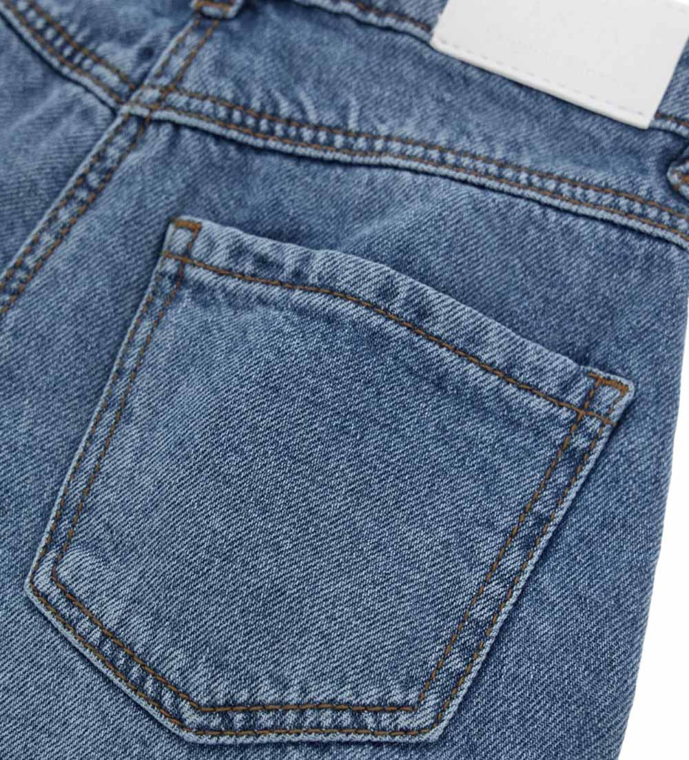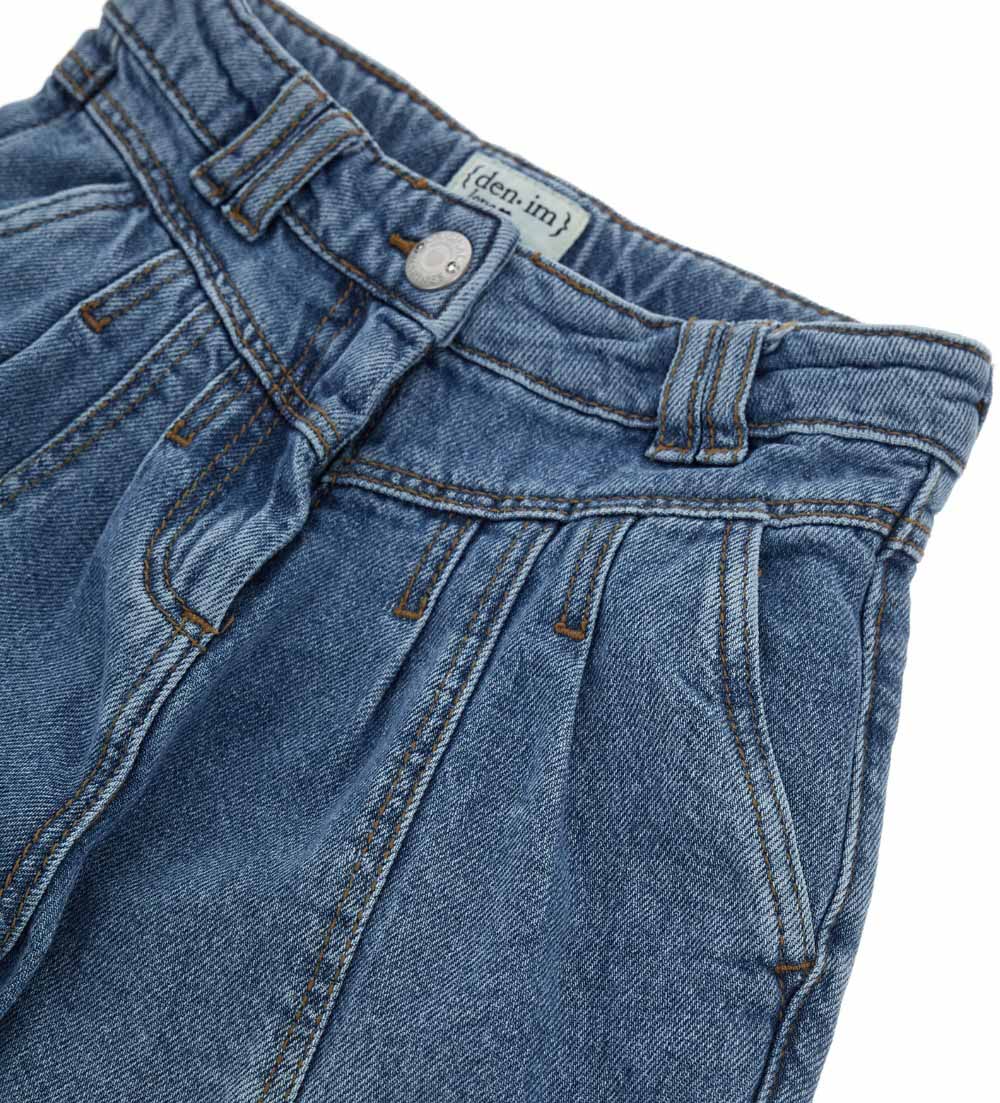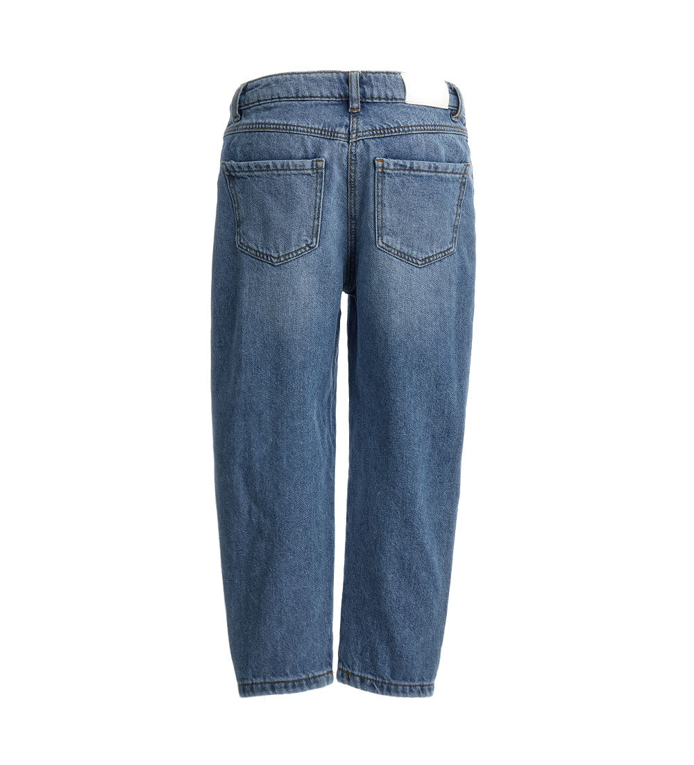 Baggy denim pants with adjustable internal waist and front zip and button closure. Front and back pockets and faux leather tab on the back.