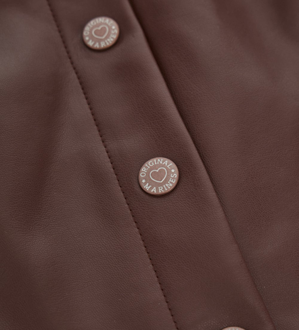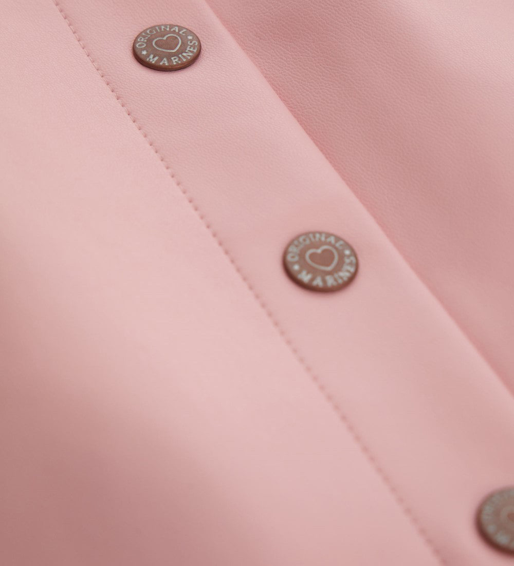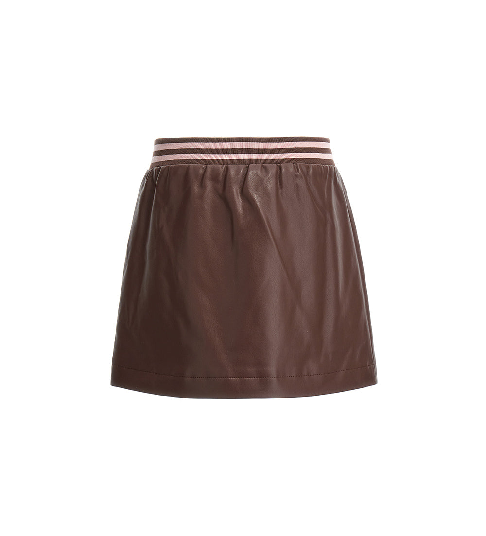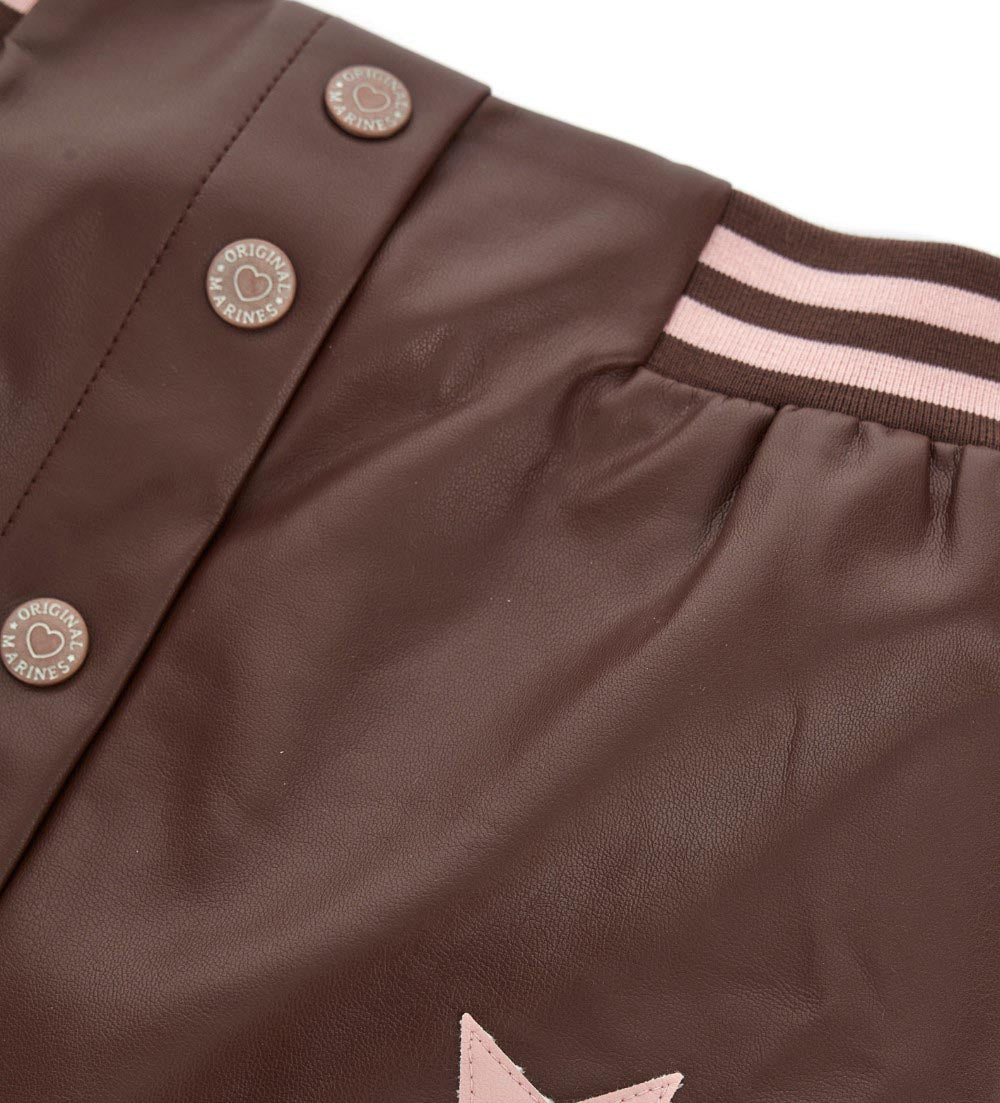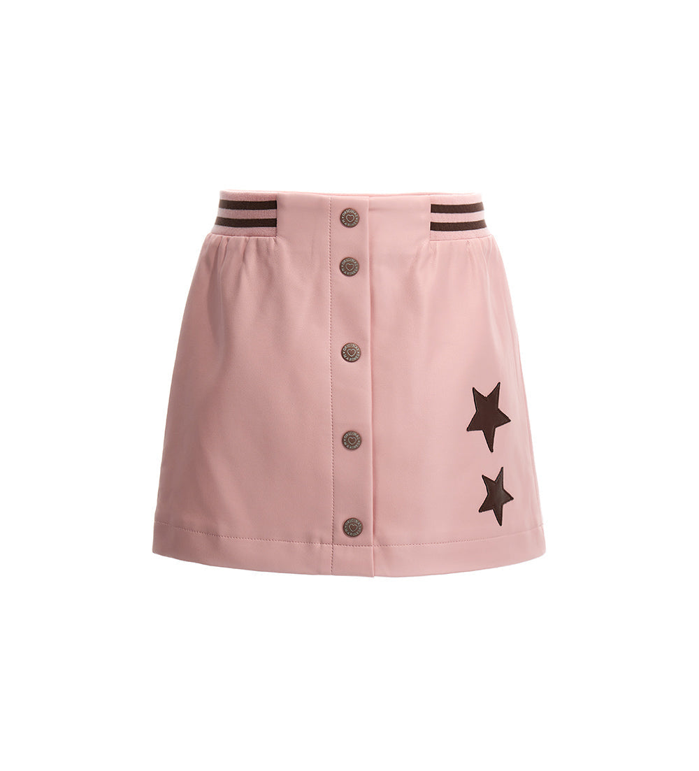 Eco-leather skirt with buttons, fake front opening, elastic waist belt with jacquard design and faux leather star applications on the front.