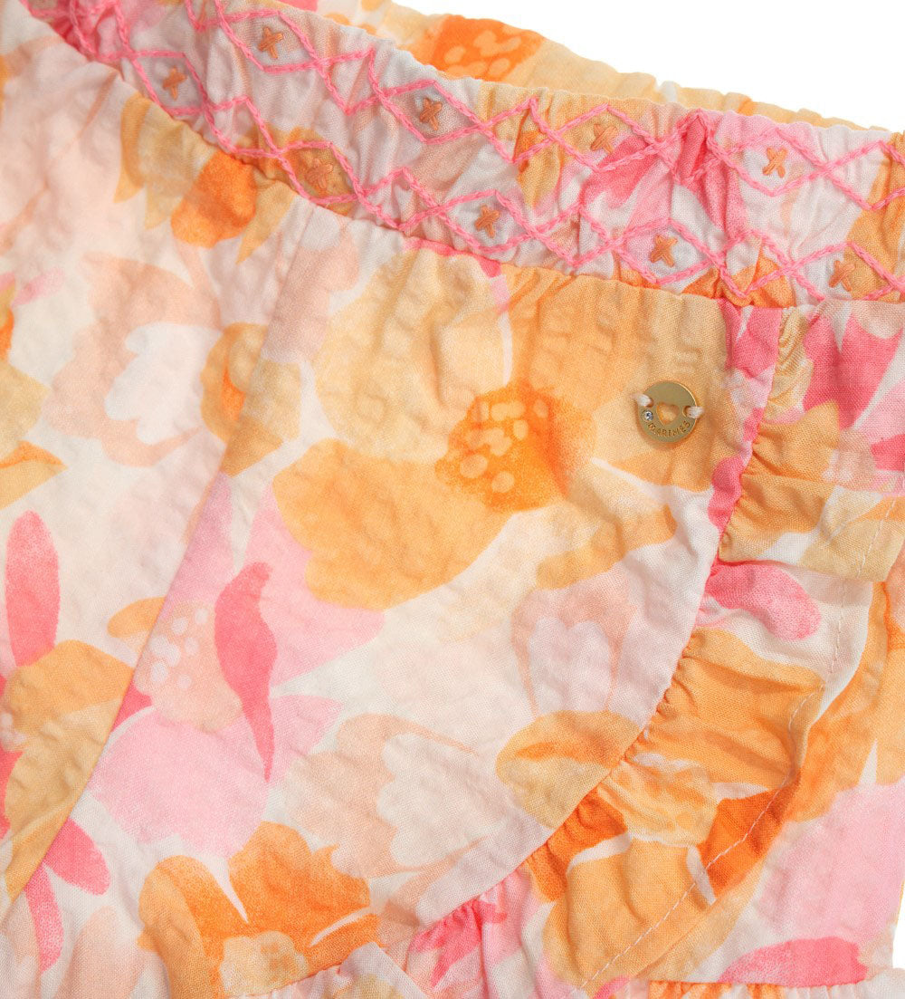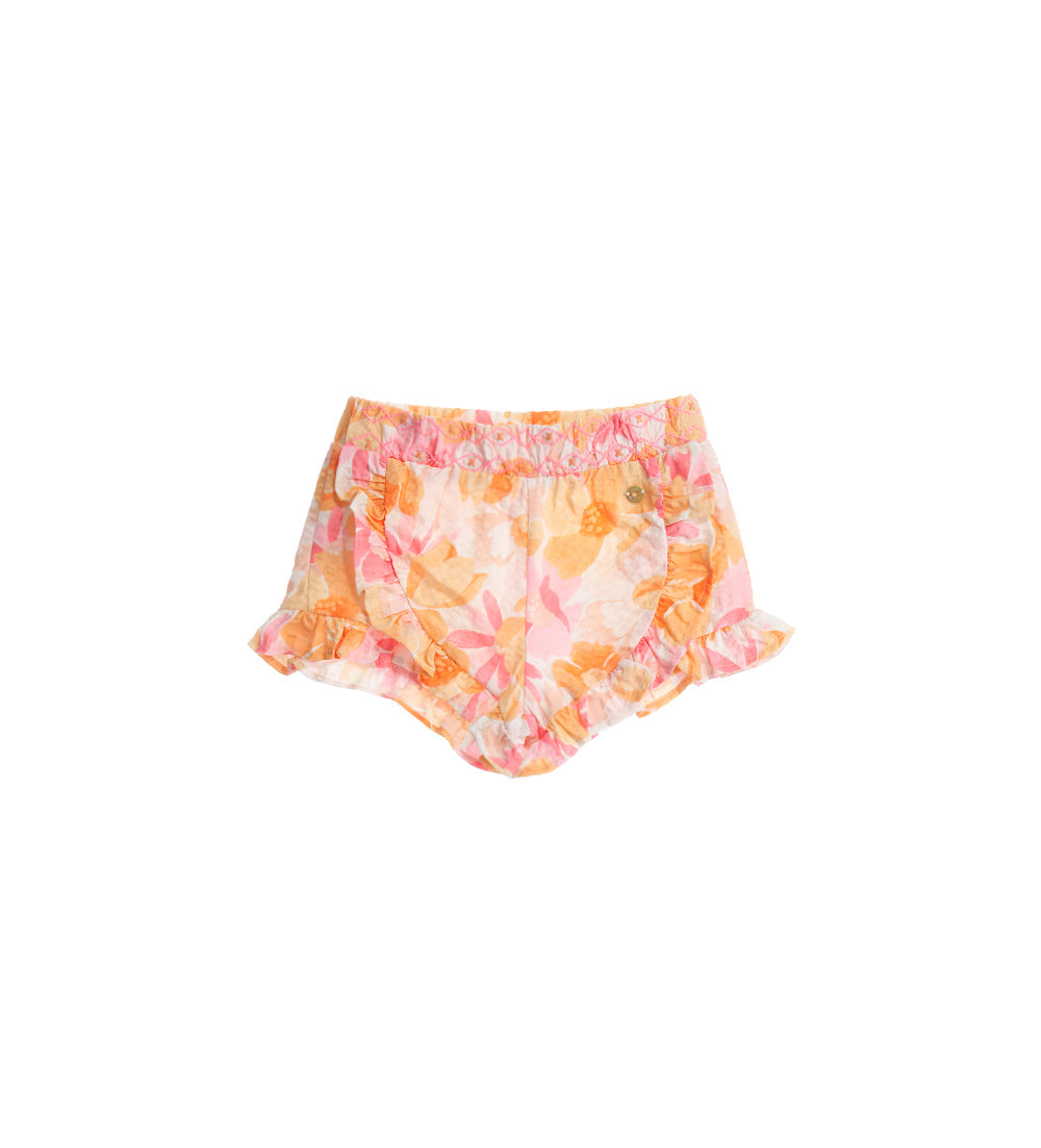 Allover printed cotton and viscose Bermuda shorts with elasticated waist, ruffles at the bottom and front.