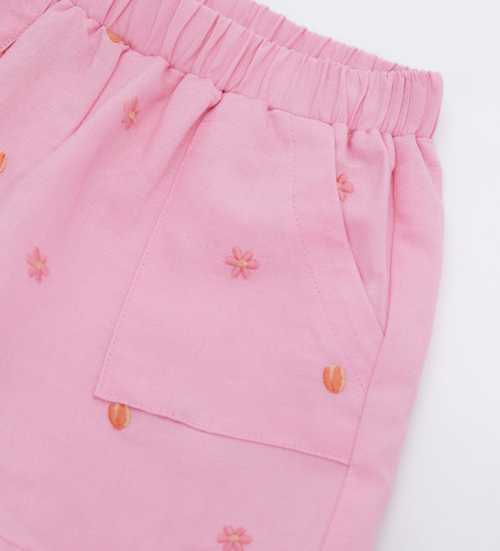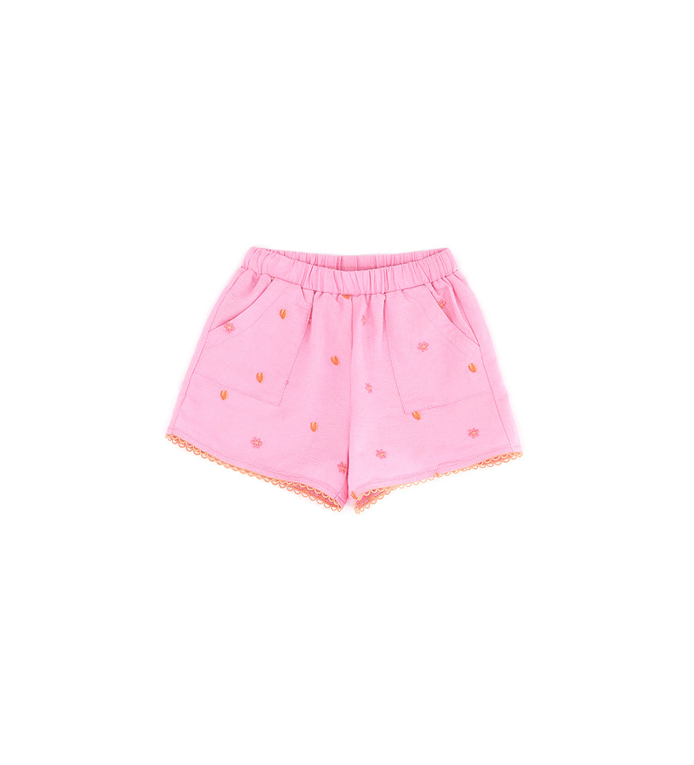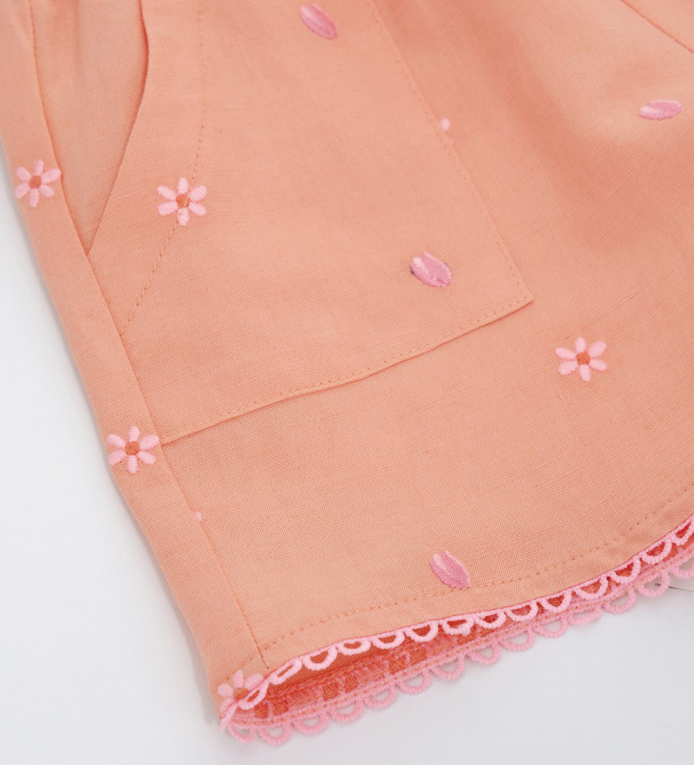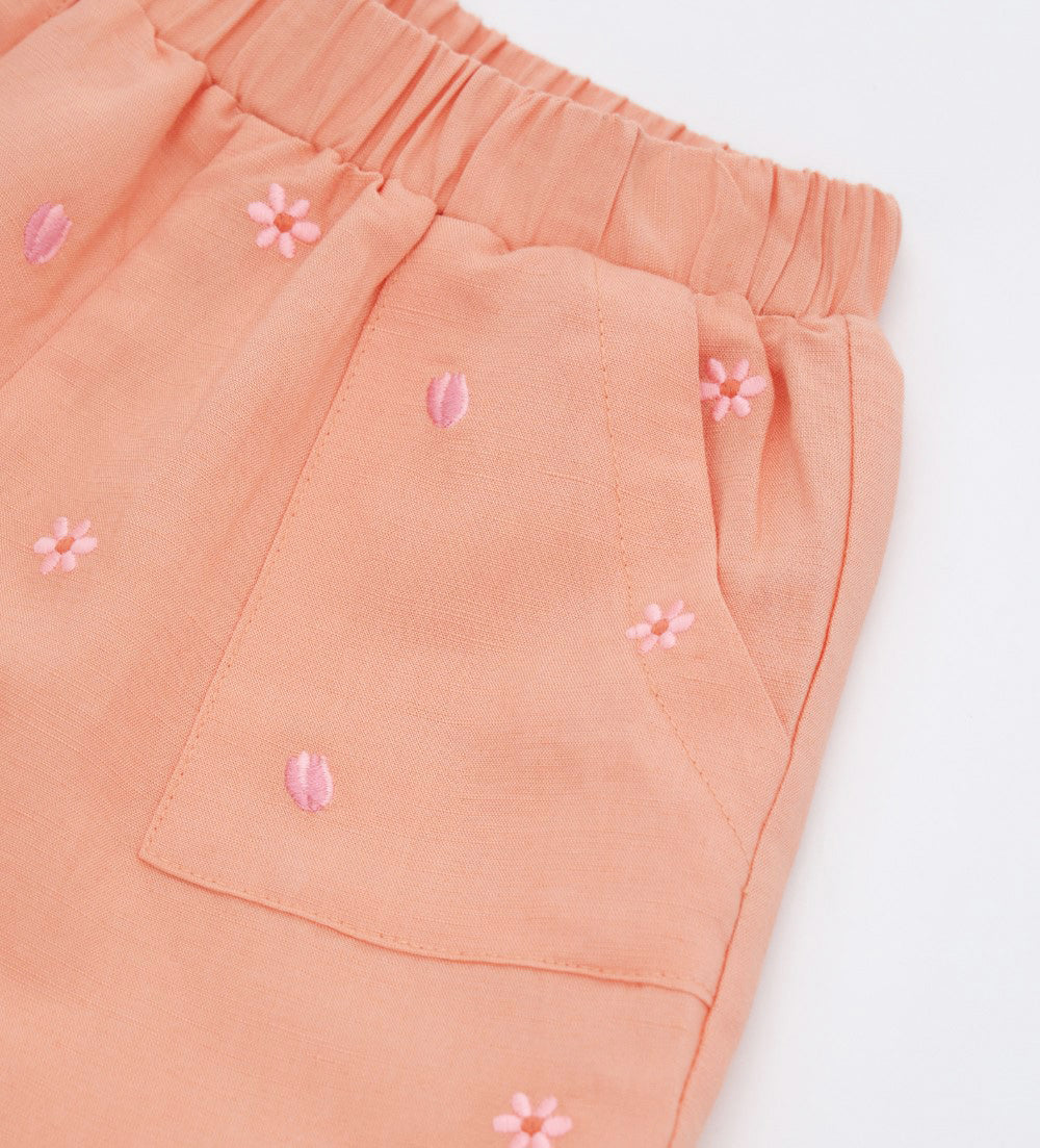 Linen blend Bermuda shorts with front patch pockets and elastic waist. Trimmings at the bottom.