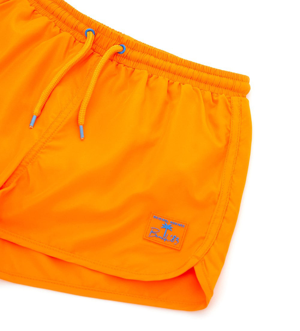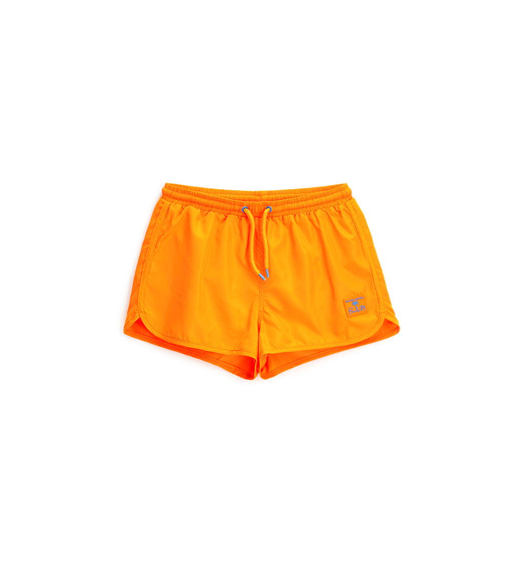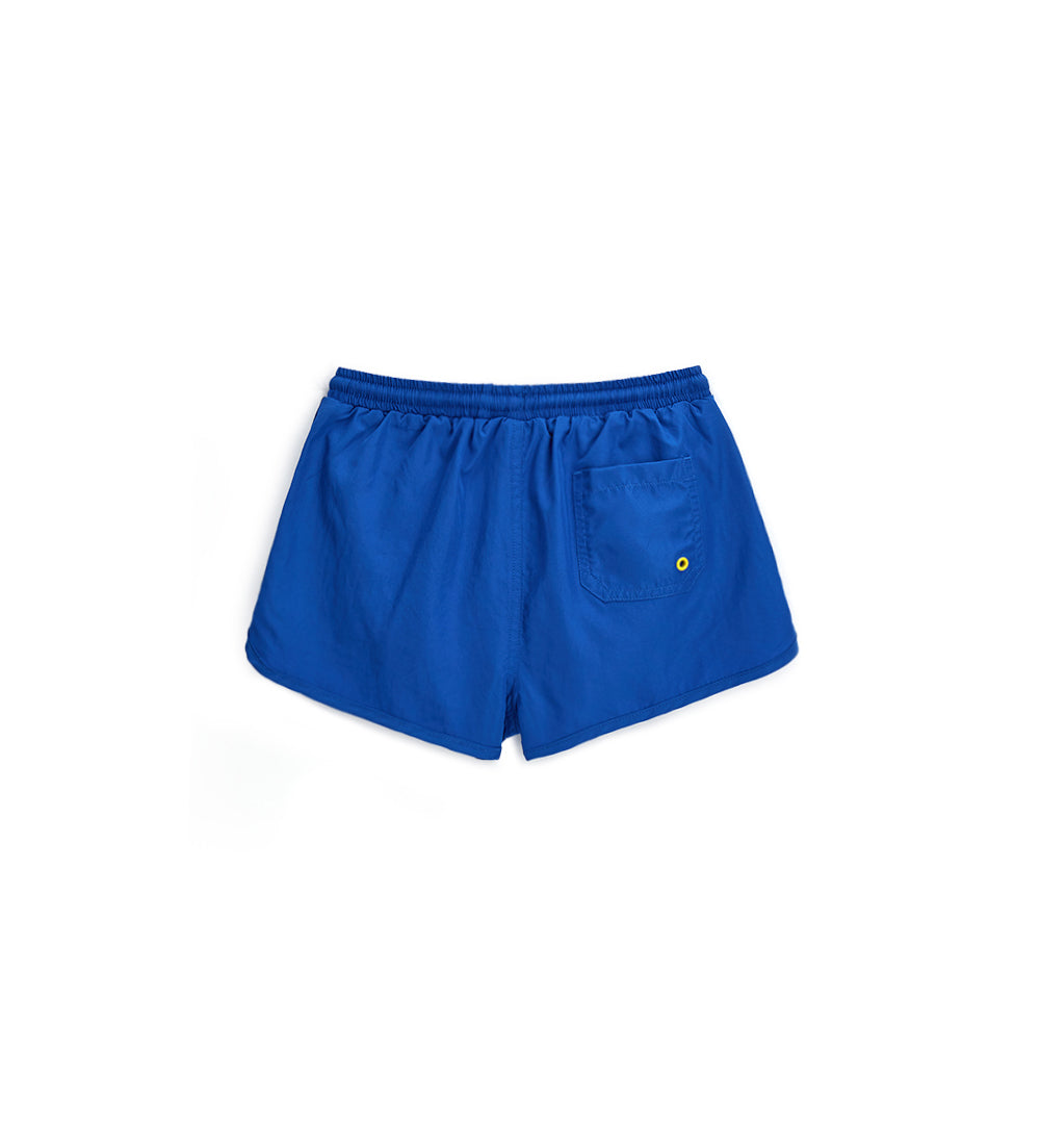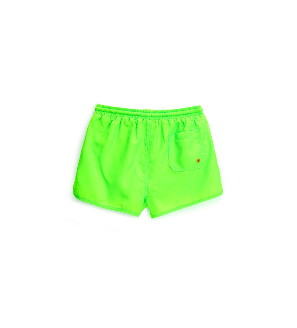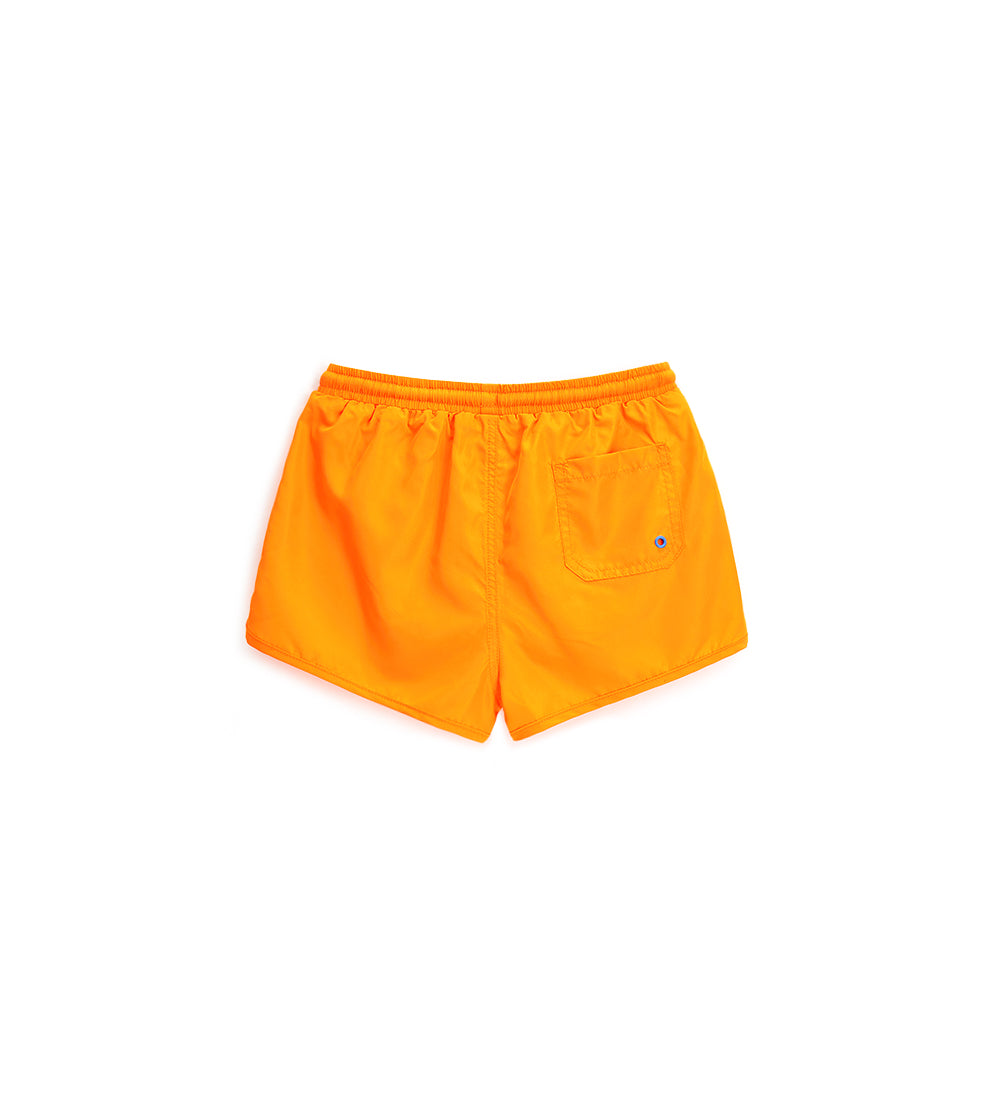 Swim shorts with internal mesh briefs, adjustable fake laces at the waist and patch pocket on the back.