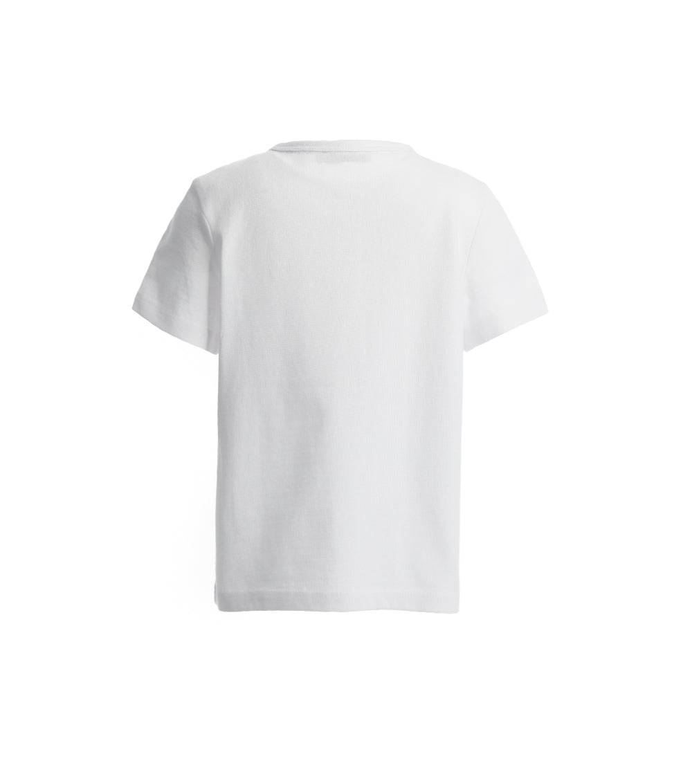 Short-sleeved textured cotton T-shirt with mandarin collar, button opening, matching stitching thread and matching cotton pocket.