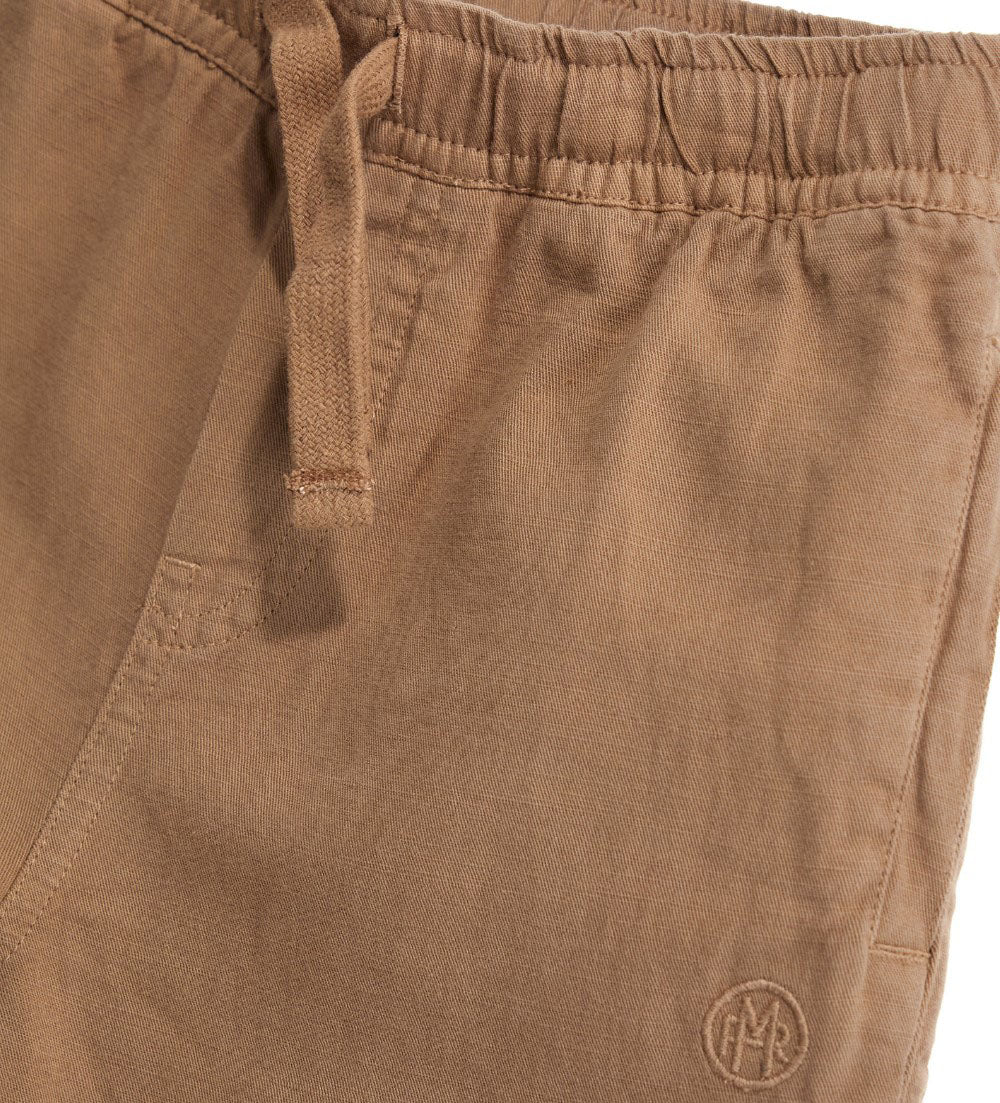 Garment-dyed linen-cotton trousers with elastic waist, adjustable drawstring, welt and patch pockets on the back.