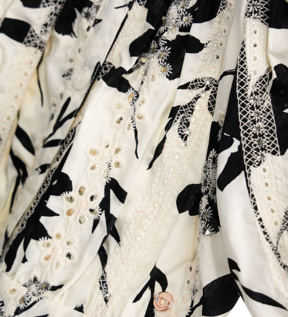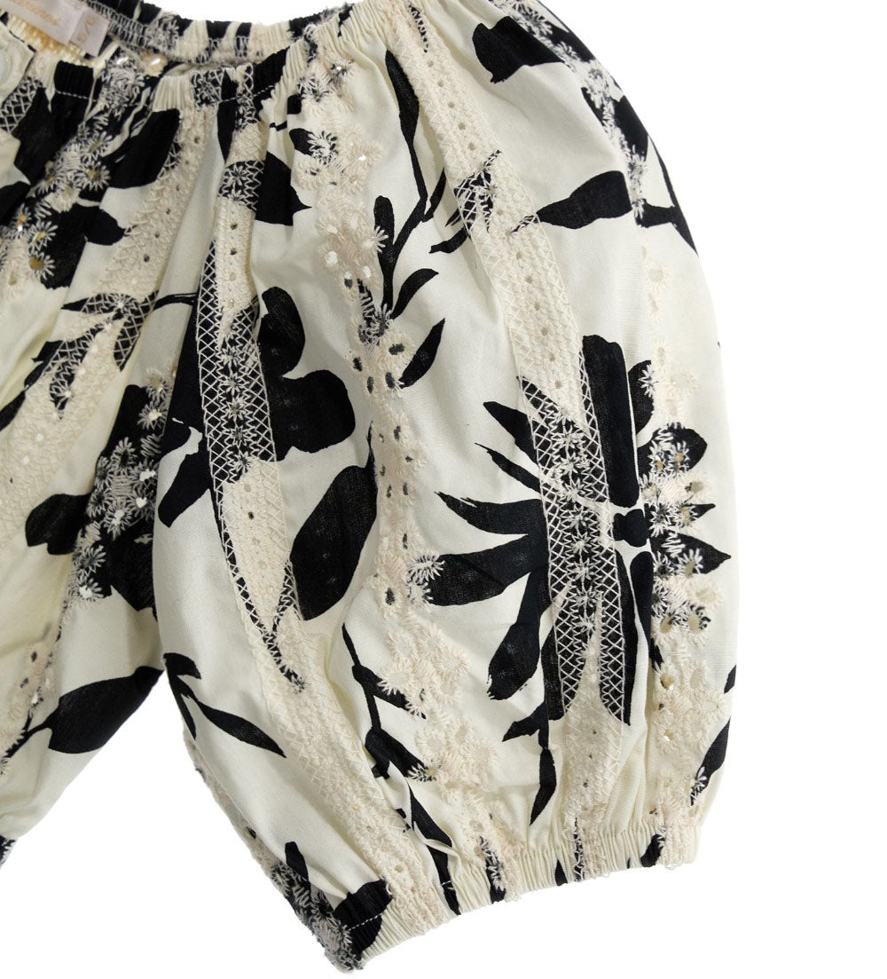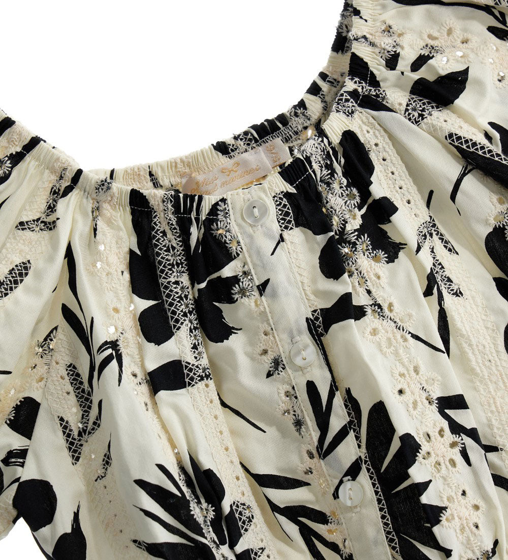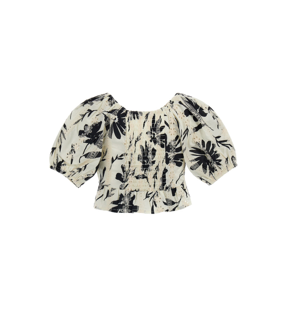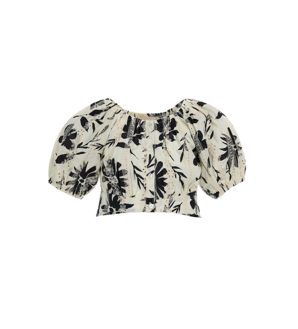 Crop top in embroidered and printed cotton with elasticated round neck and balloon raglan sleeves with elastic. Front opening with small faux mother-of-pearl buttons, elastic decoration on the back and medal with logo on the front.