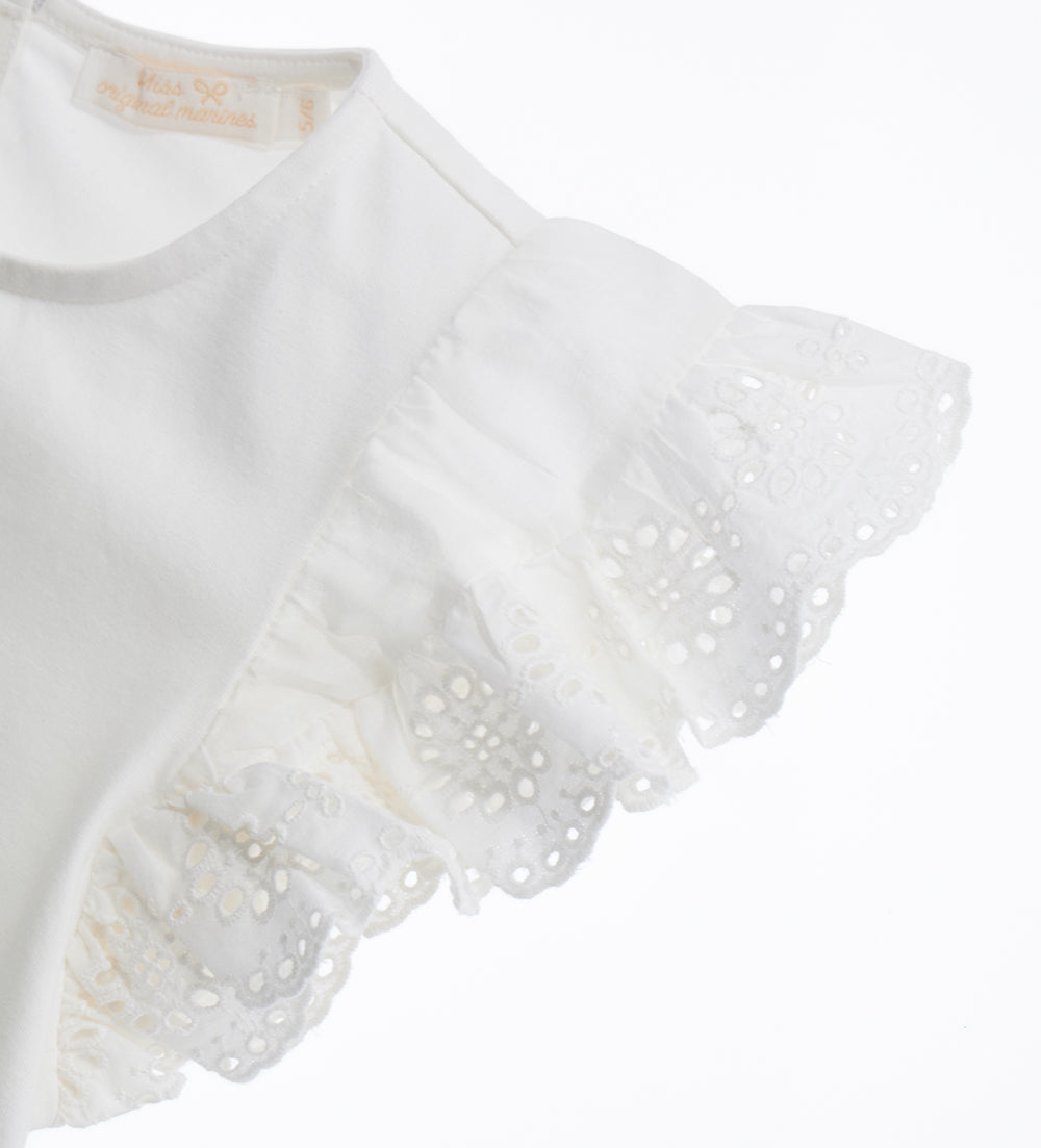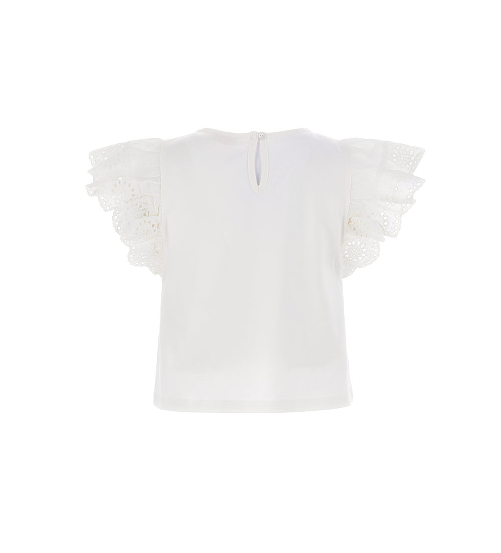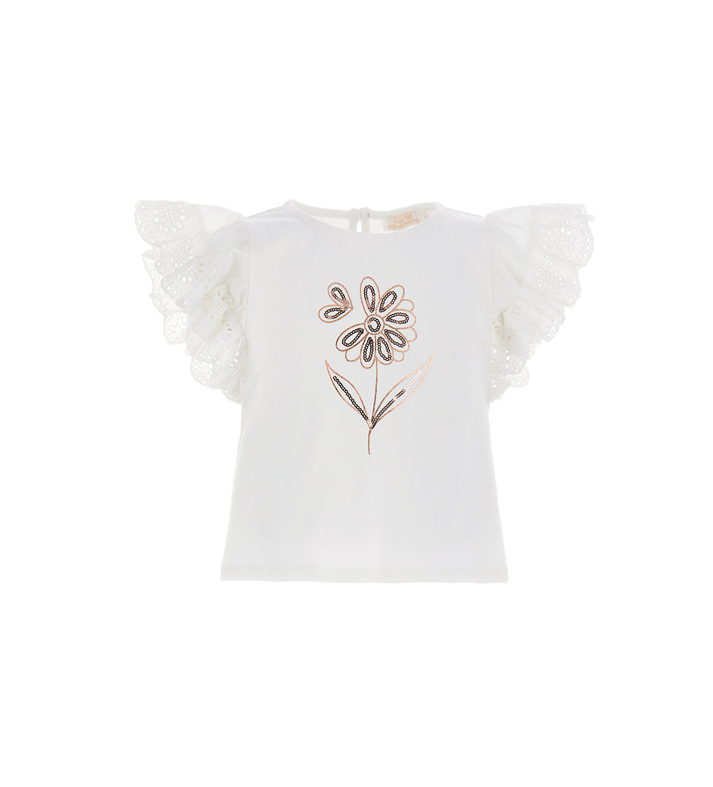 Stretch cotton T-shirt with round neck, short sleeves and embroidered light cotton ruffles. Glitter and sequin print.