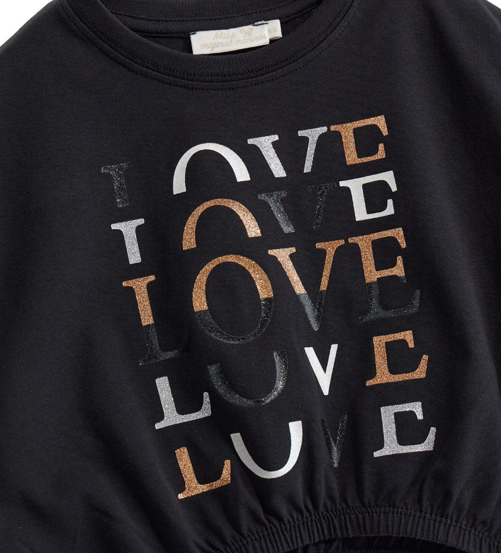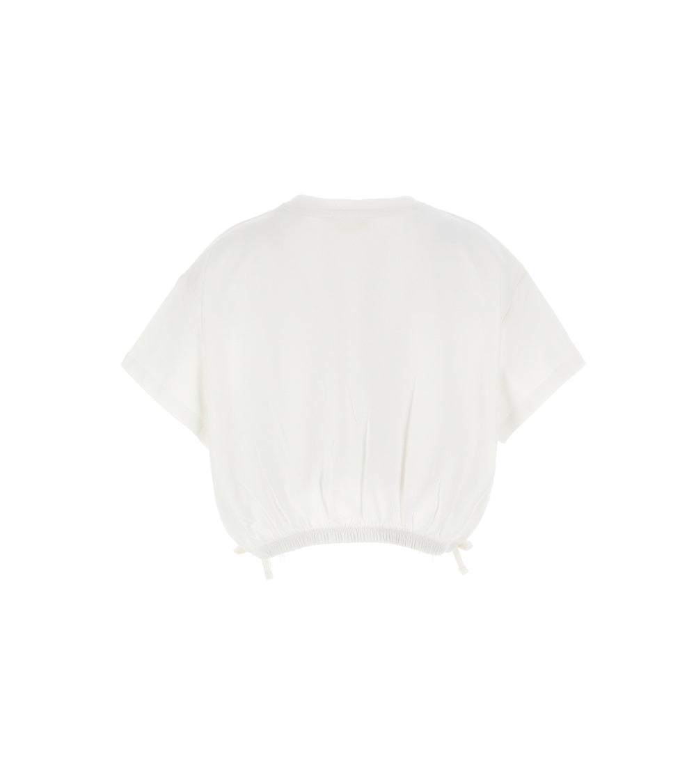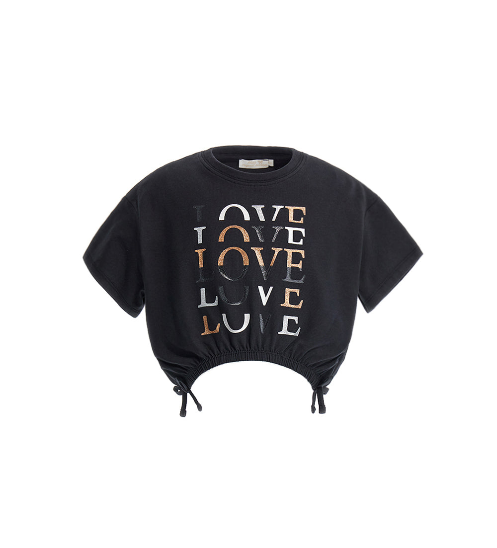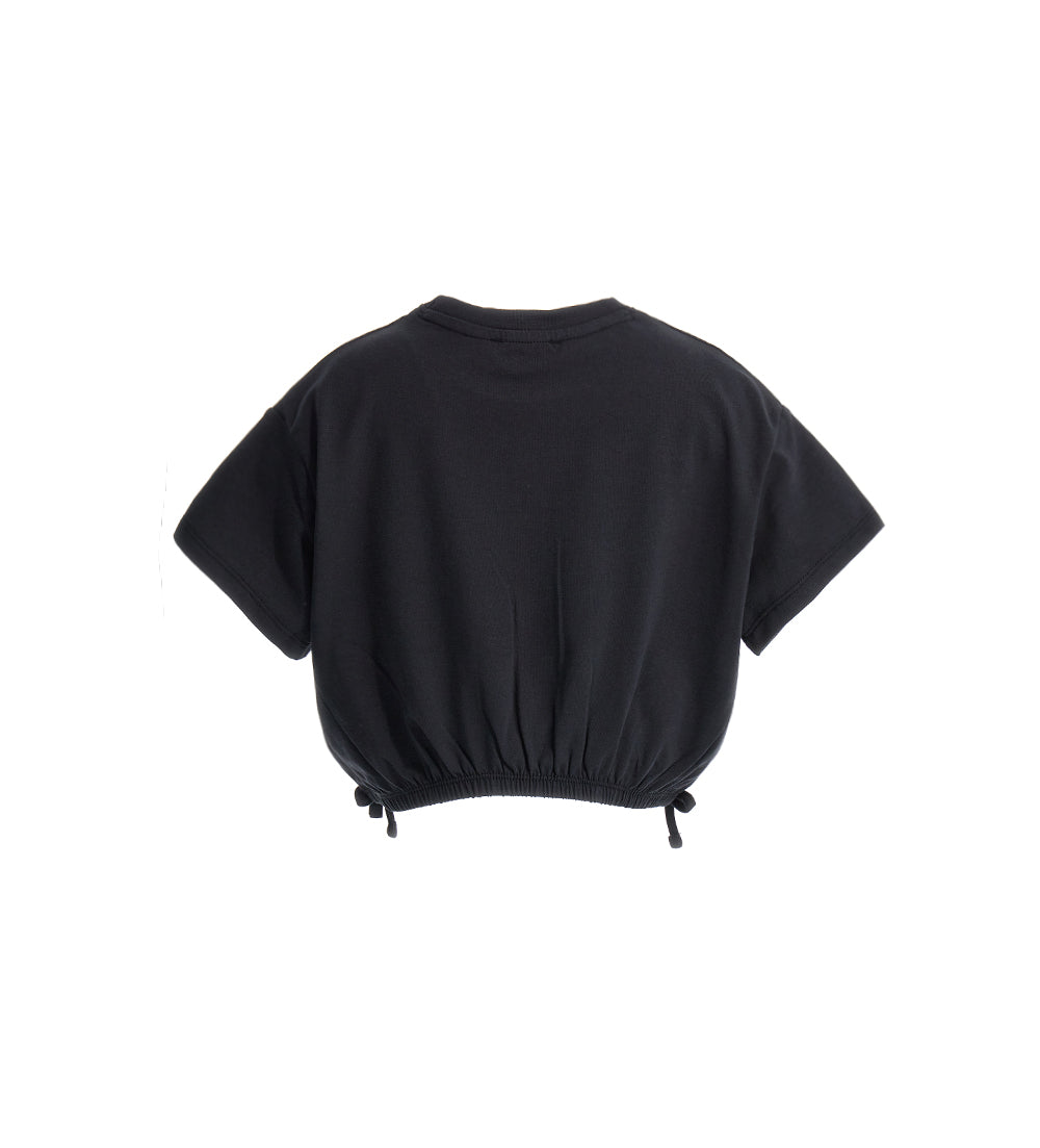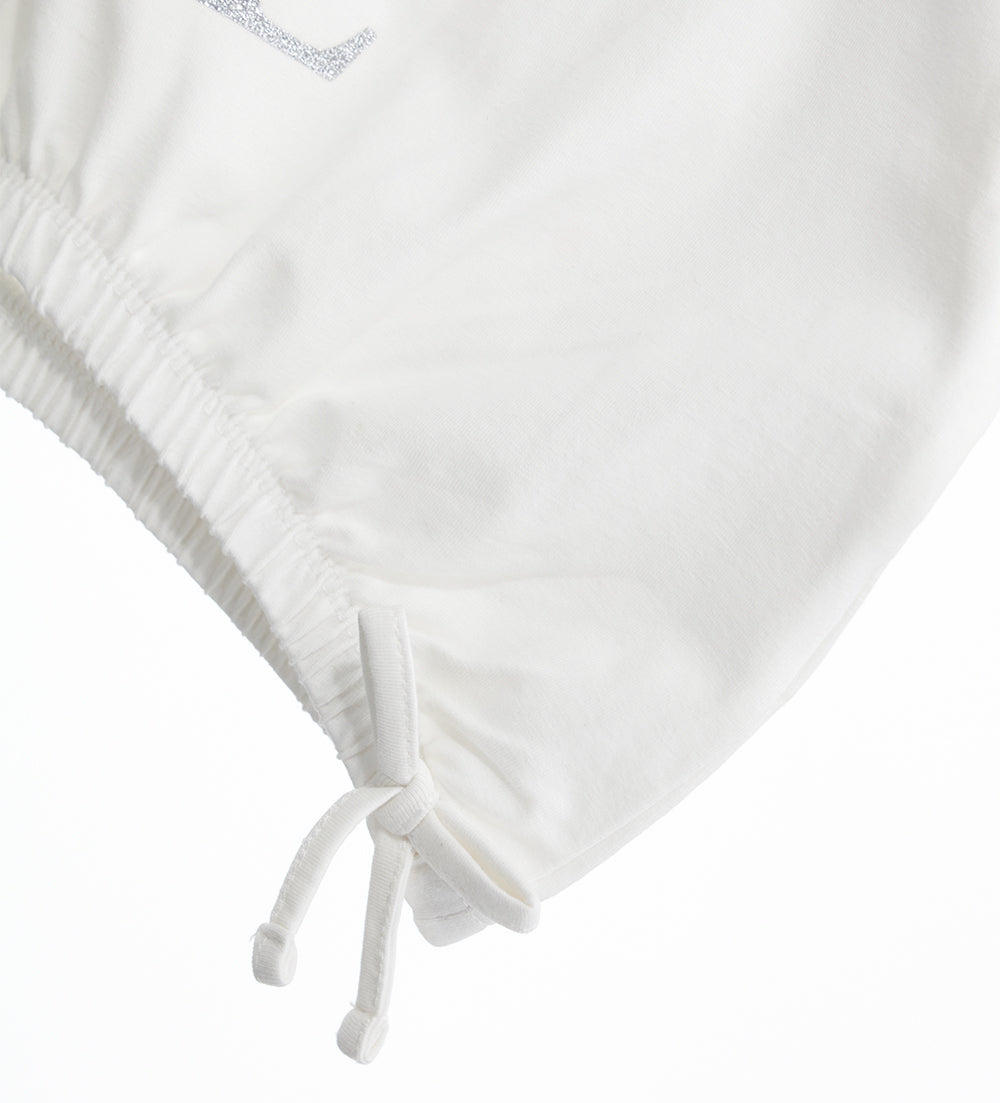 Short T-shirt in stretch cotton with ribbed round neck and short sleeves. Elastic on the bottom and fake drawstring with fixed side laces and glitter print on the front.
