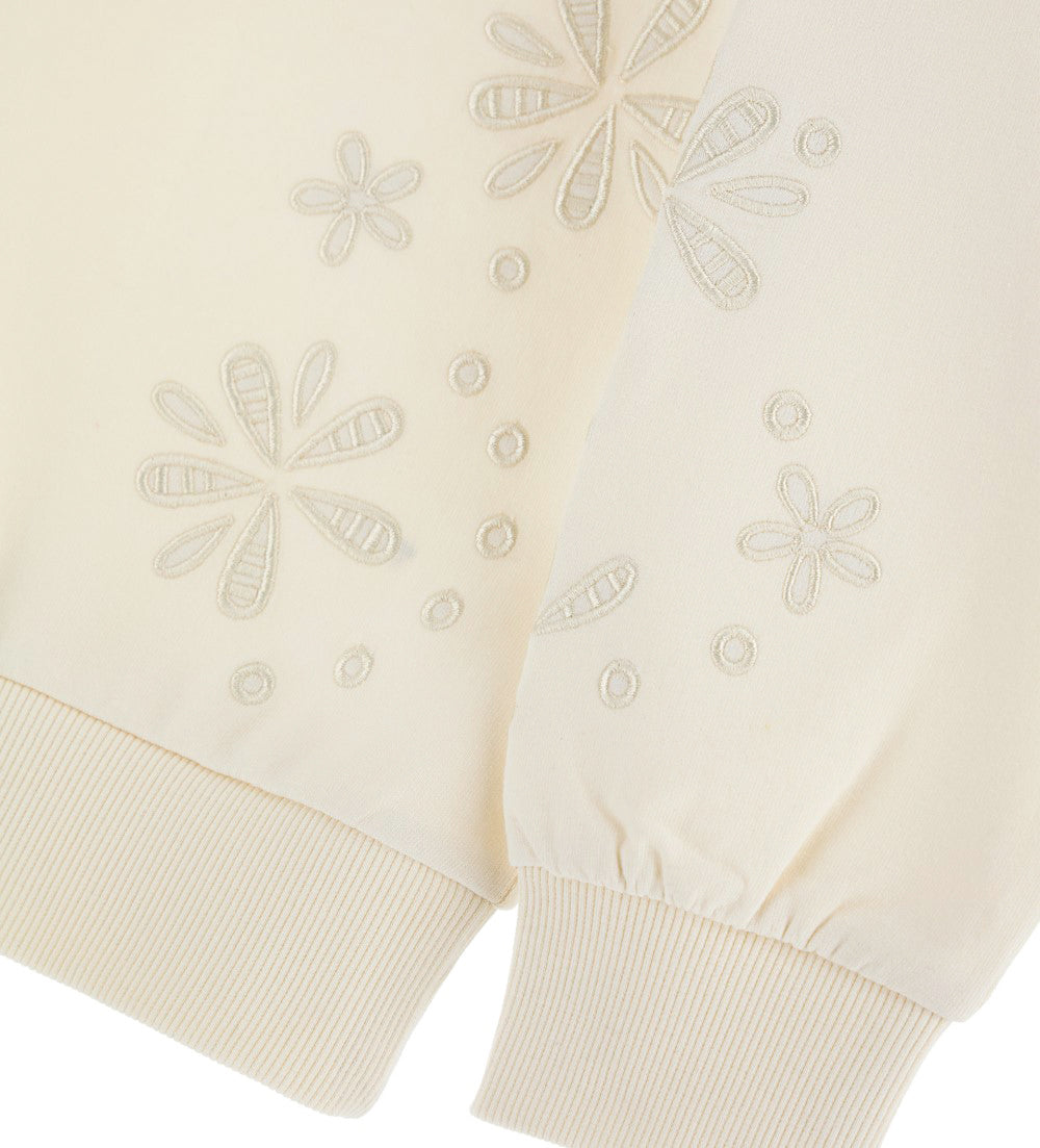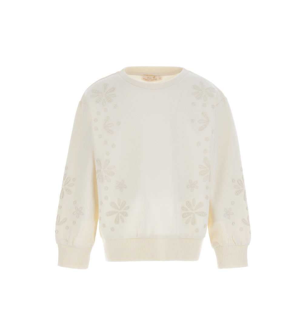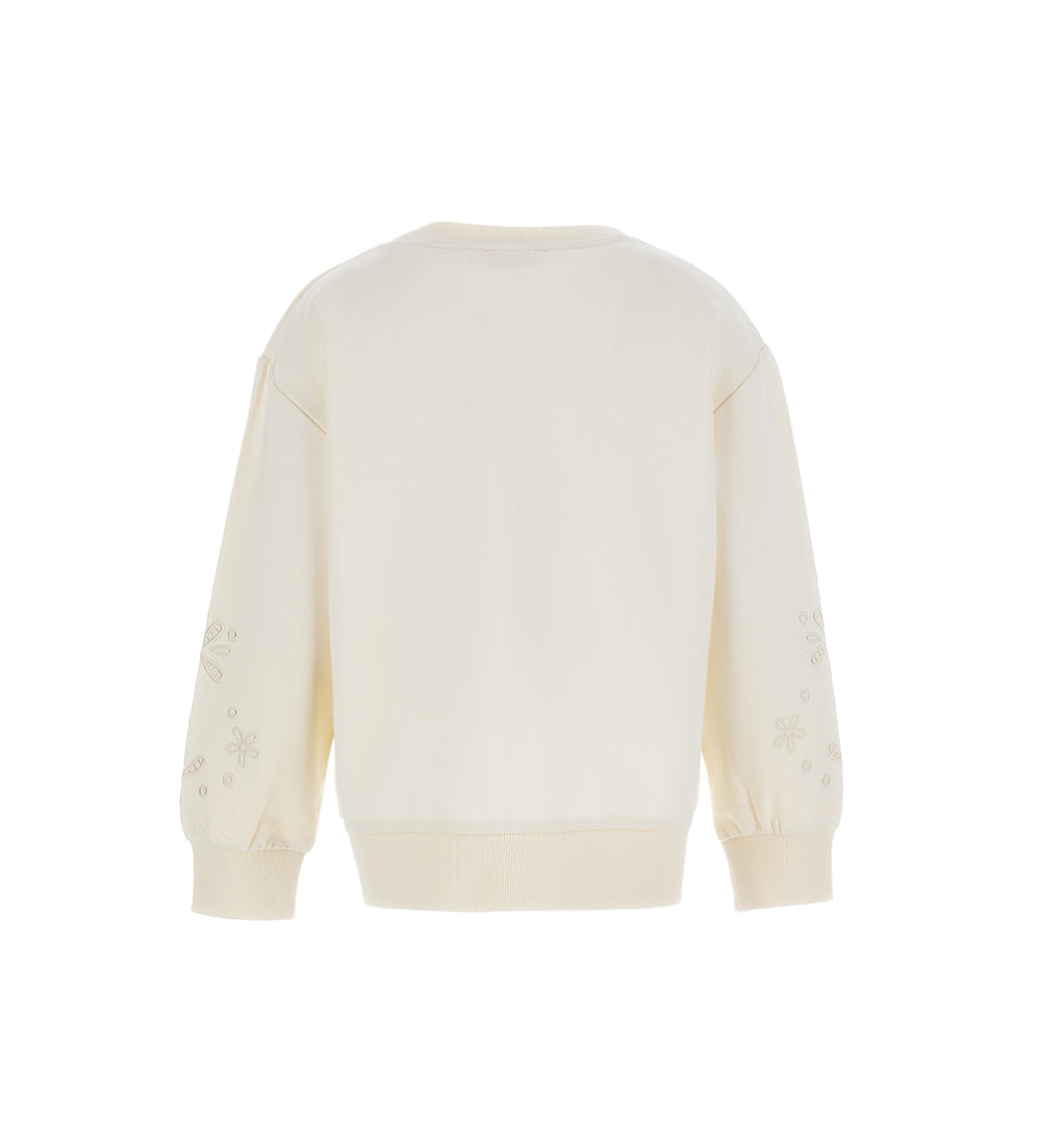 Lightweight stretch cotton sweatshirt with round neck and long sleeves with ribbed finish, matching decorative embroidery on the front and on the sleeves.