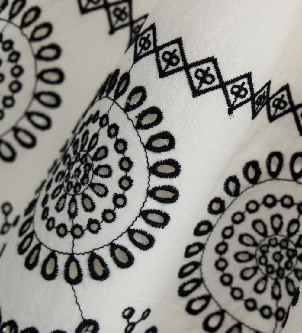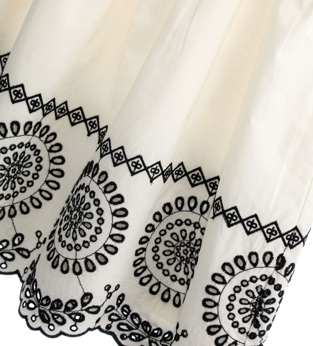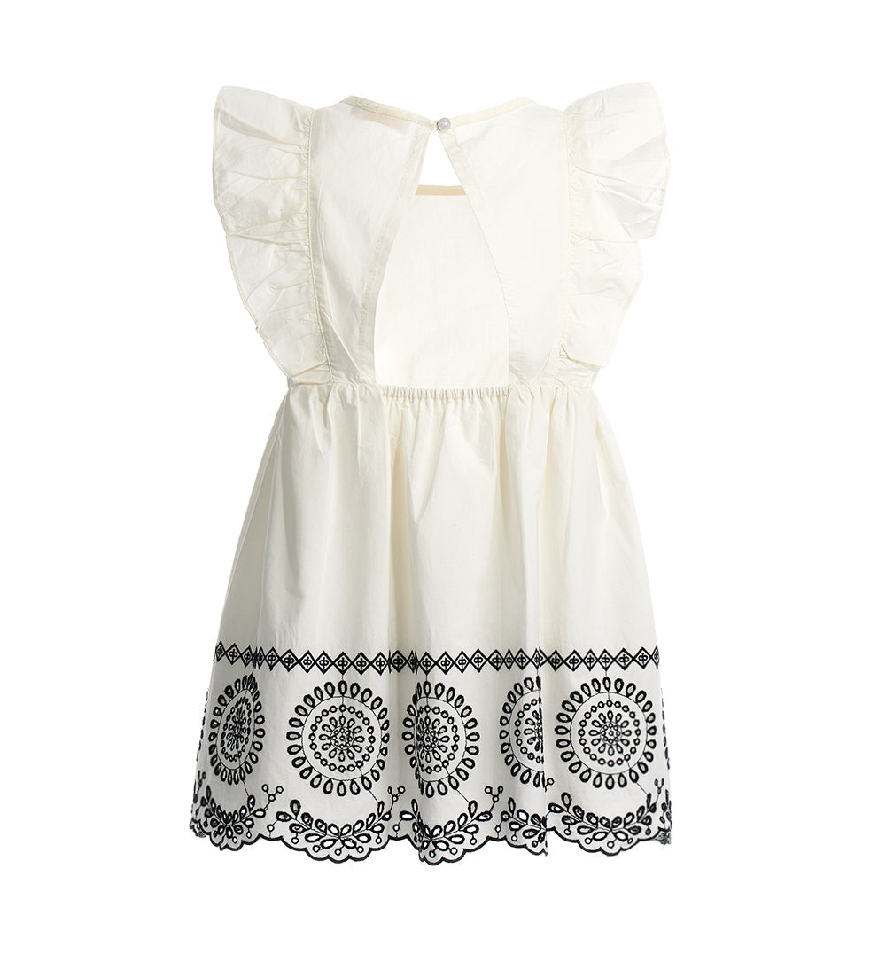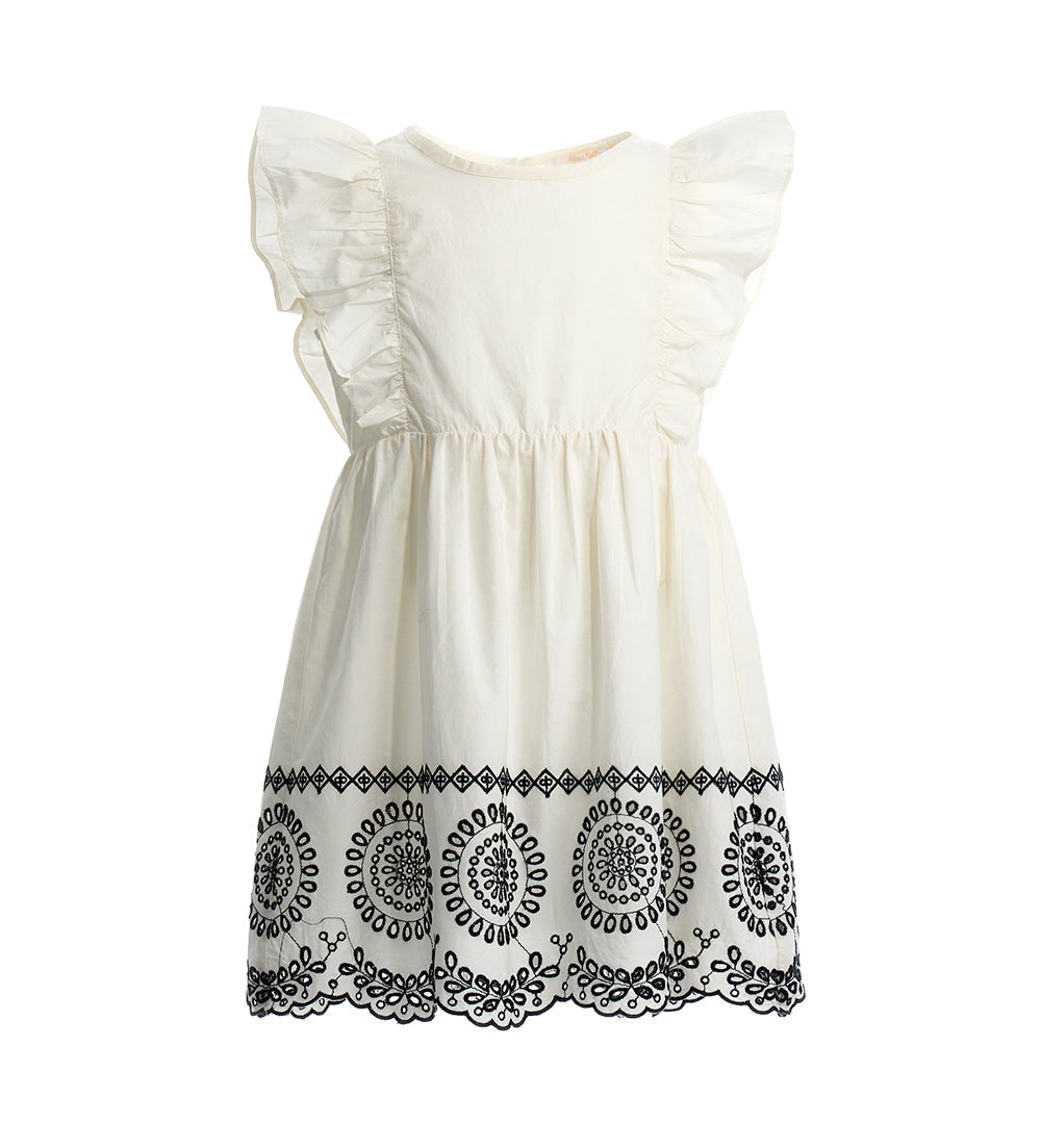 Dress in shaved cotton armholes with front ruffles with a round neck, opening on the back with a small faux mother-of-pearl button. Internal lining in light cotton and embroidered decoration on the bottom with ethnic design.