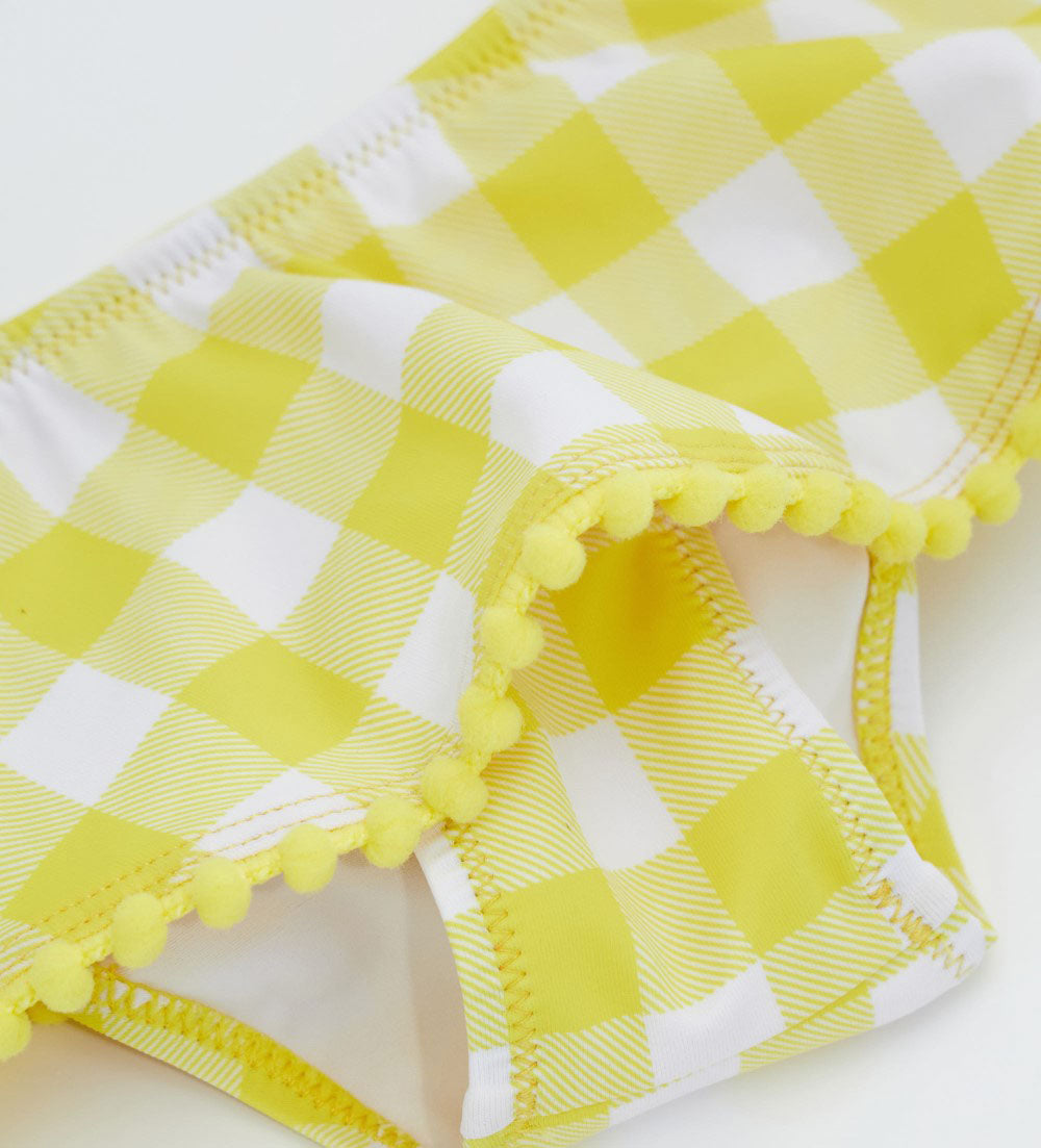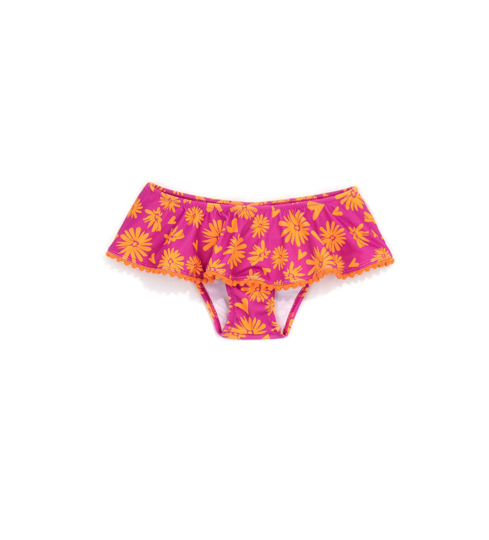 Lycra swim briefs with ruffles at the waist, allover print and trimmings on the ruffles.
