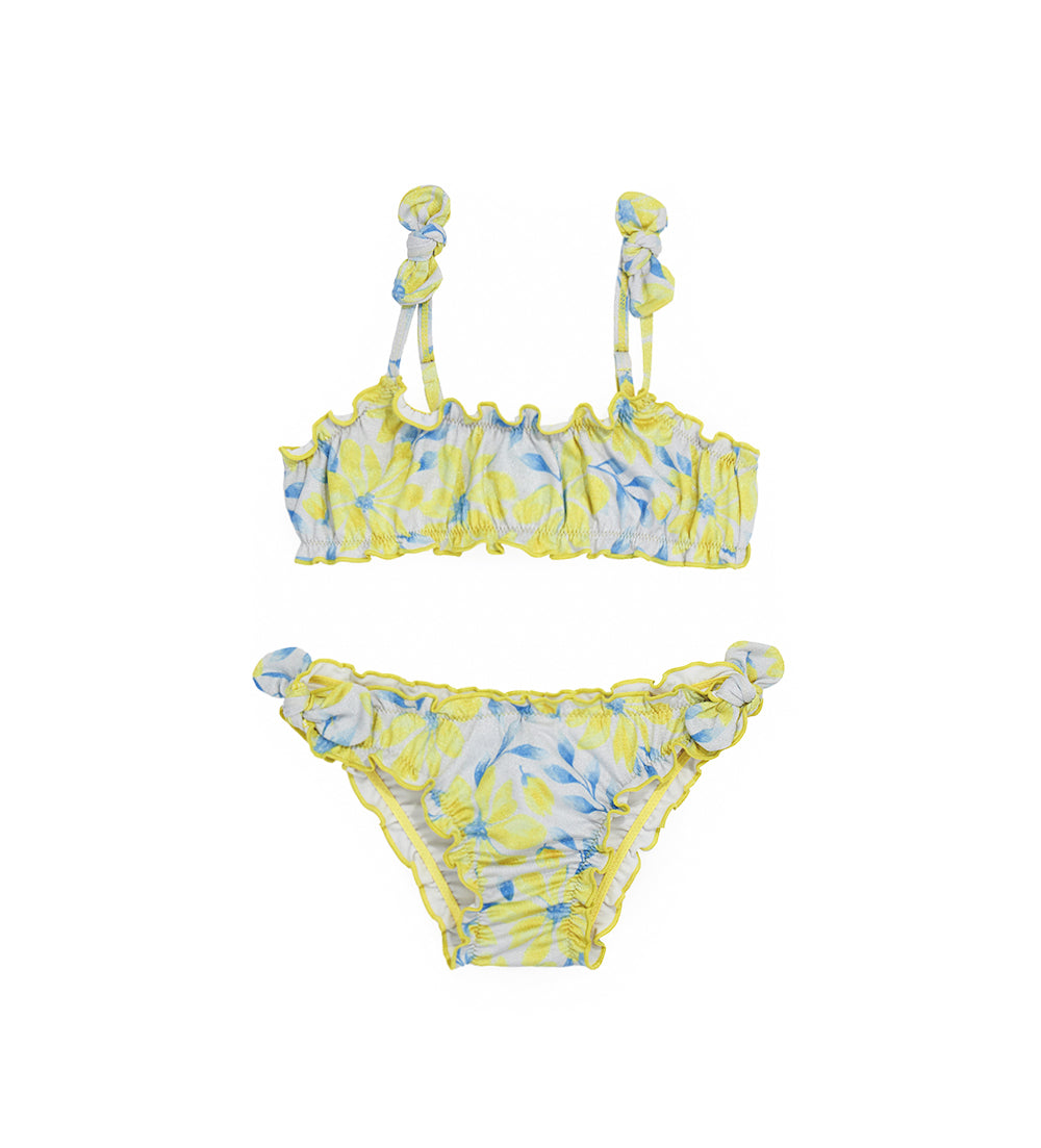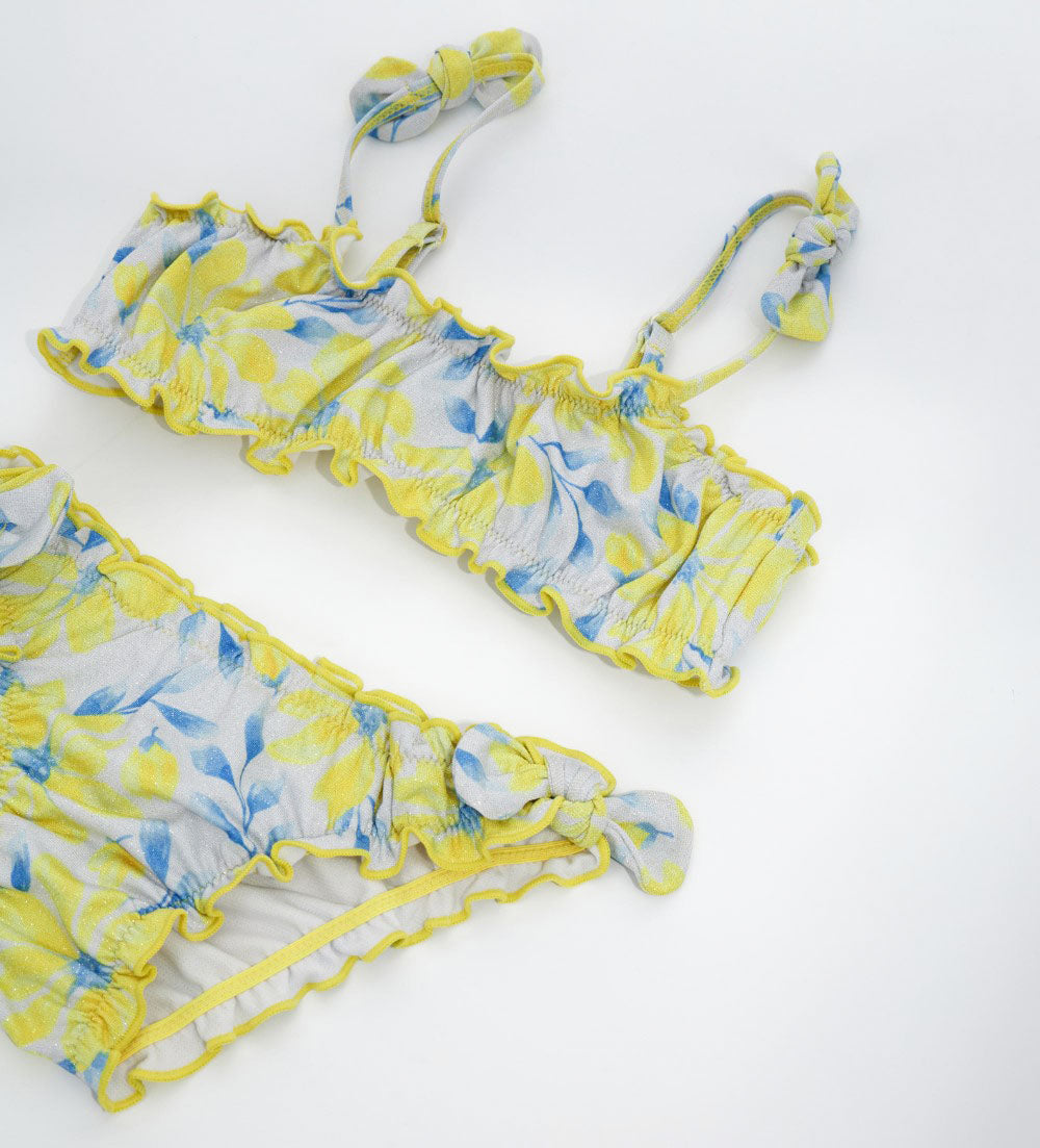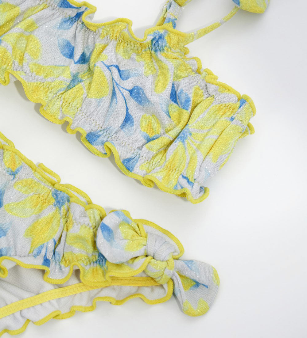 Two-piece lycra swimsuit with allover print: top with suspender strap and swim briefs with applied bows.