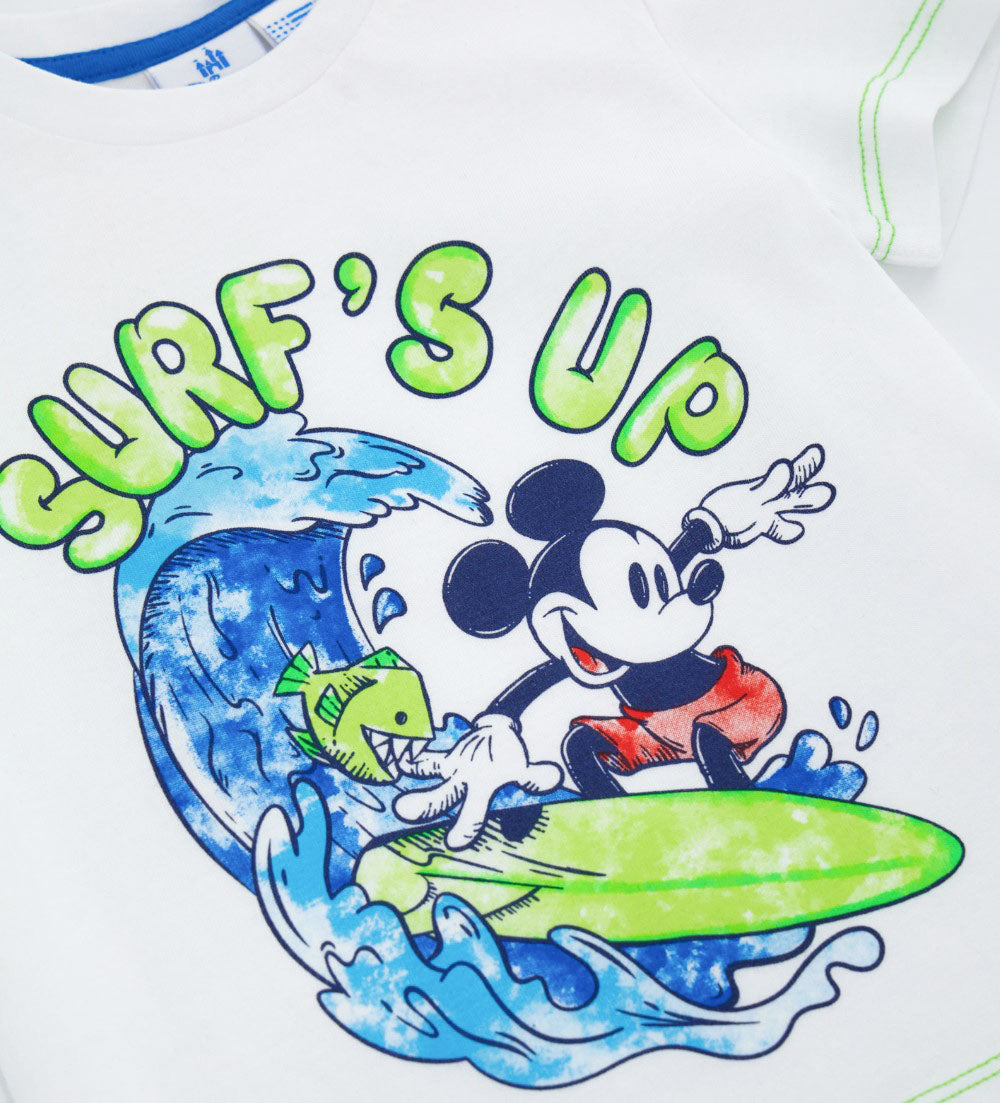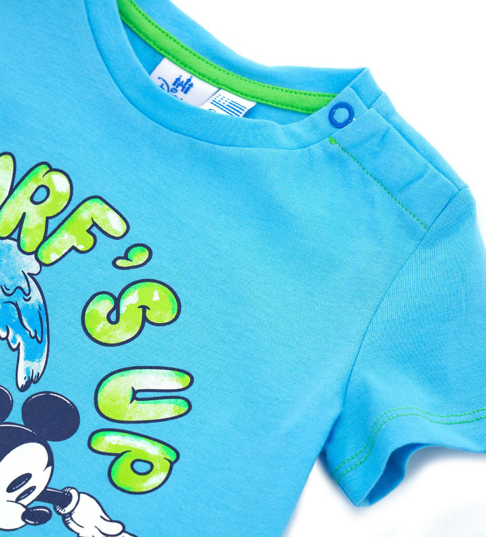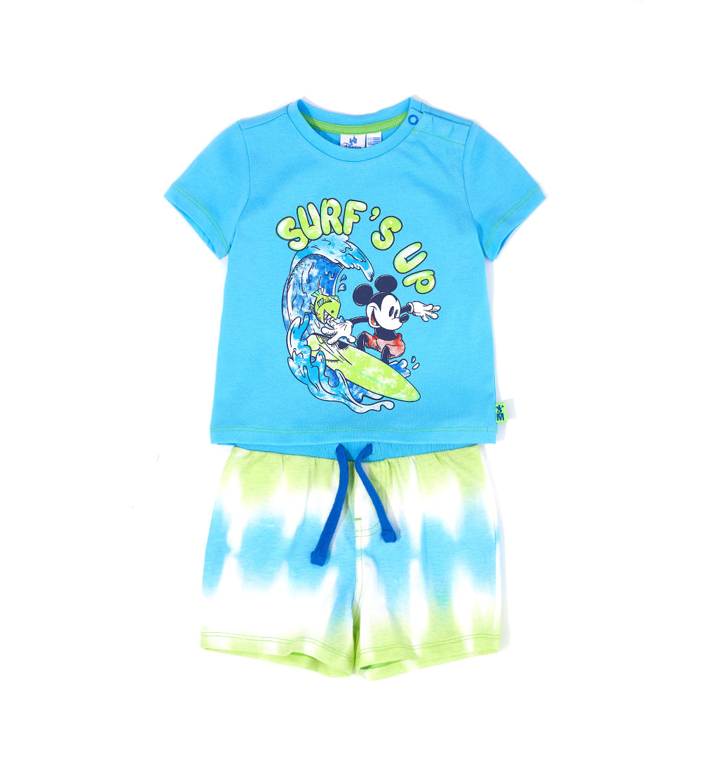 Disney cotton t-shirt and shorts set: printed short-sleeved T-shirt, round neck, press studs on the shoulder. Printed shorts with contrasting elastic waistband and adjustable drawstring.
