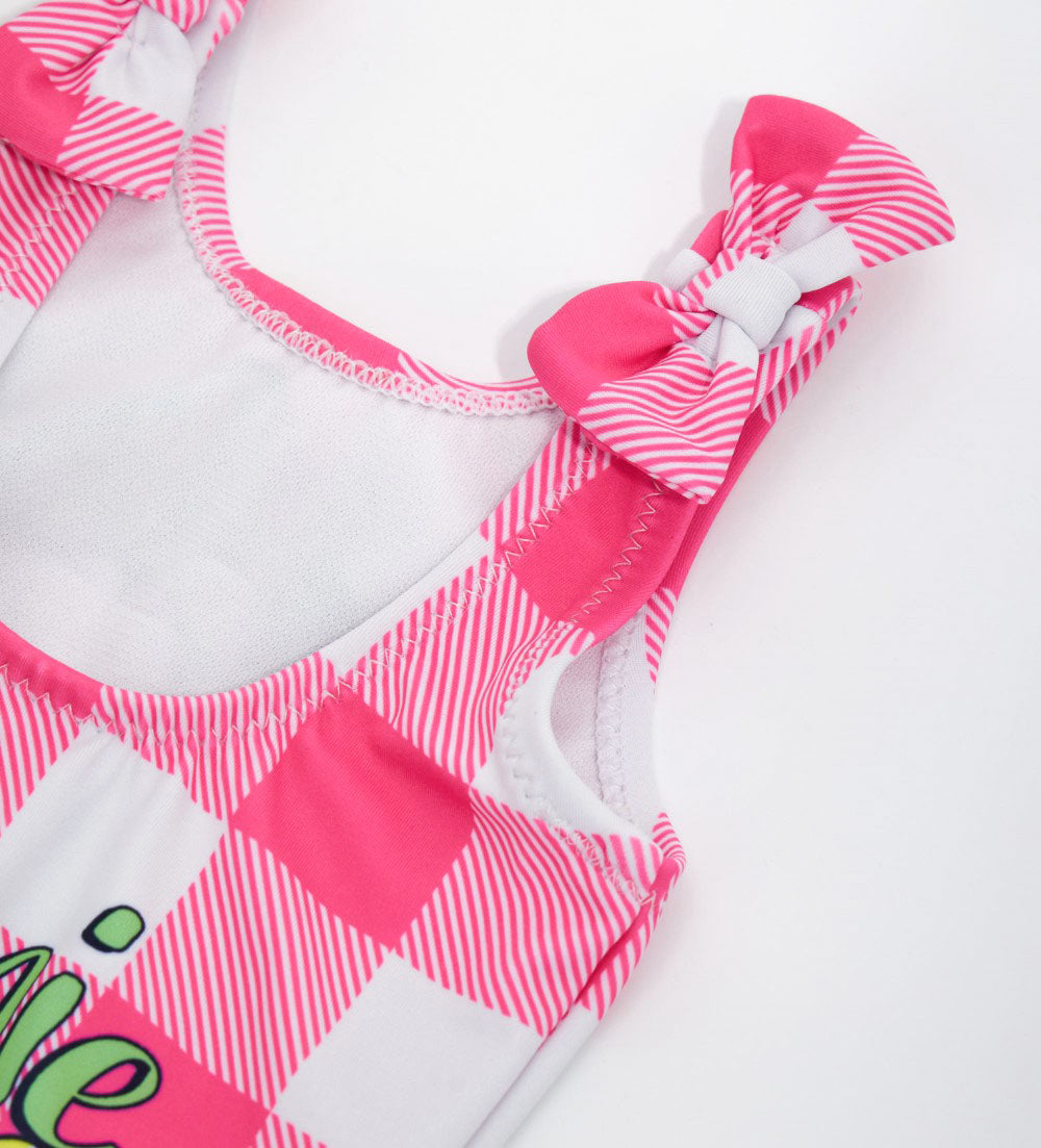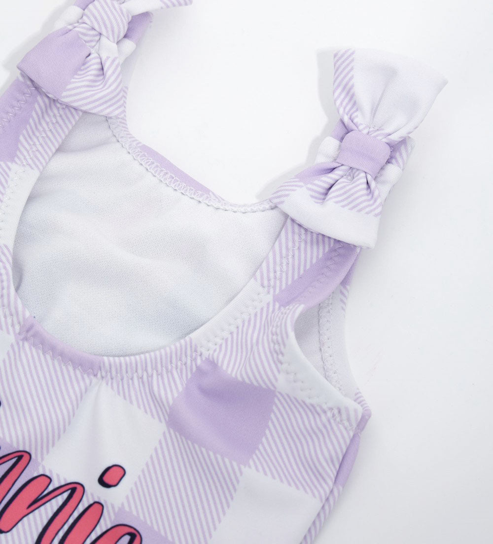Disney one-piece swimsuit in lycra with allover print with bows on the straps.