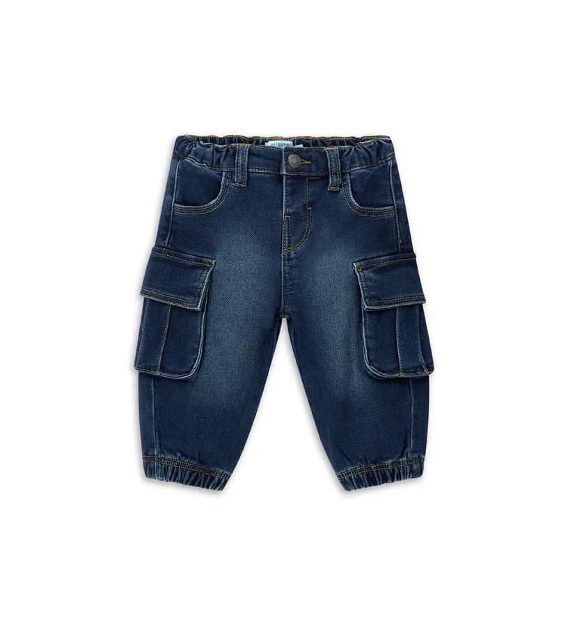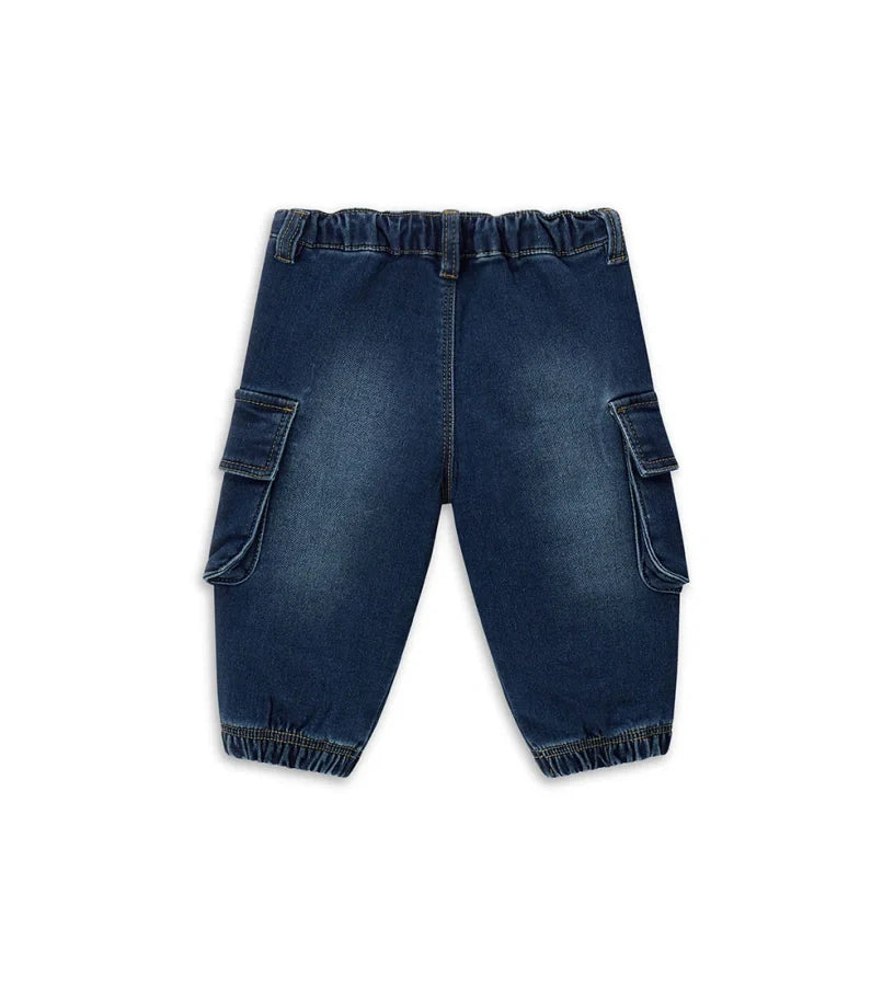 Denim sweatpants with elasticated waist, front pockets, side pockets and welt pockets at the back.
