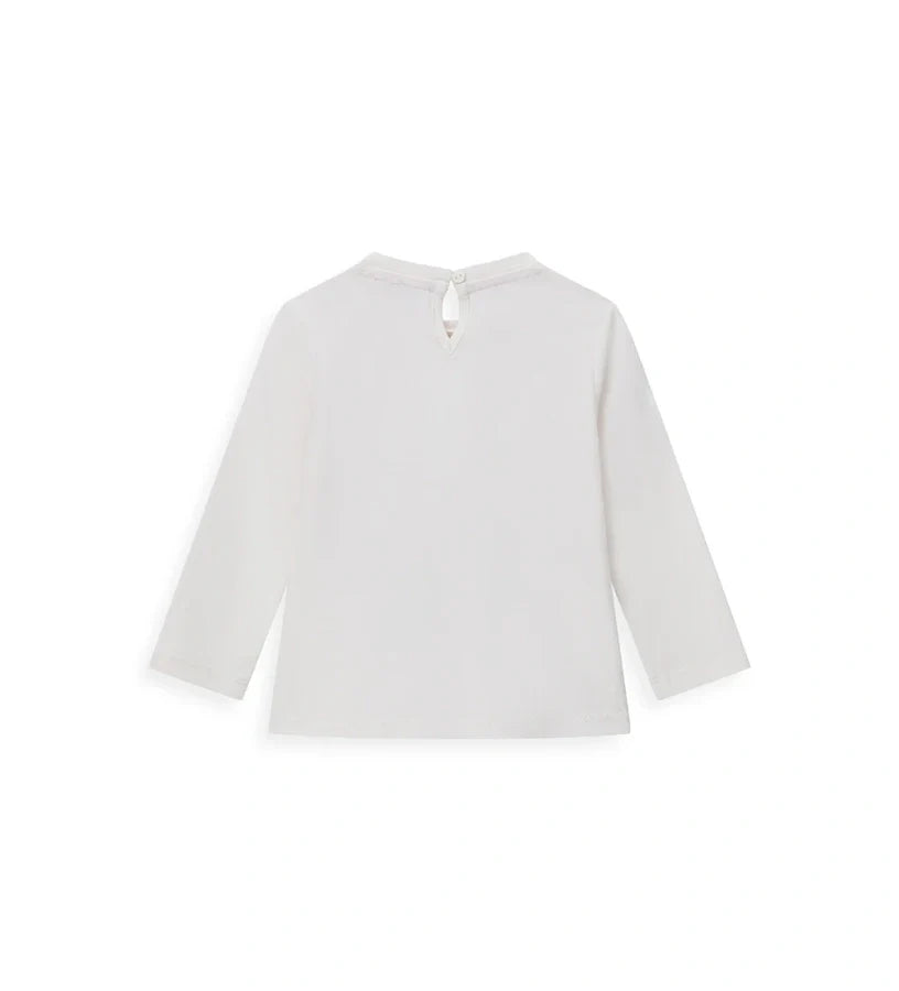 Stretch cotton T-shirt, round neck and long sleeve with shiny print and bright rhinestones.