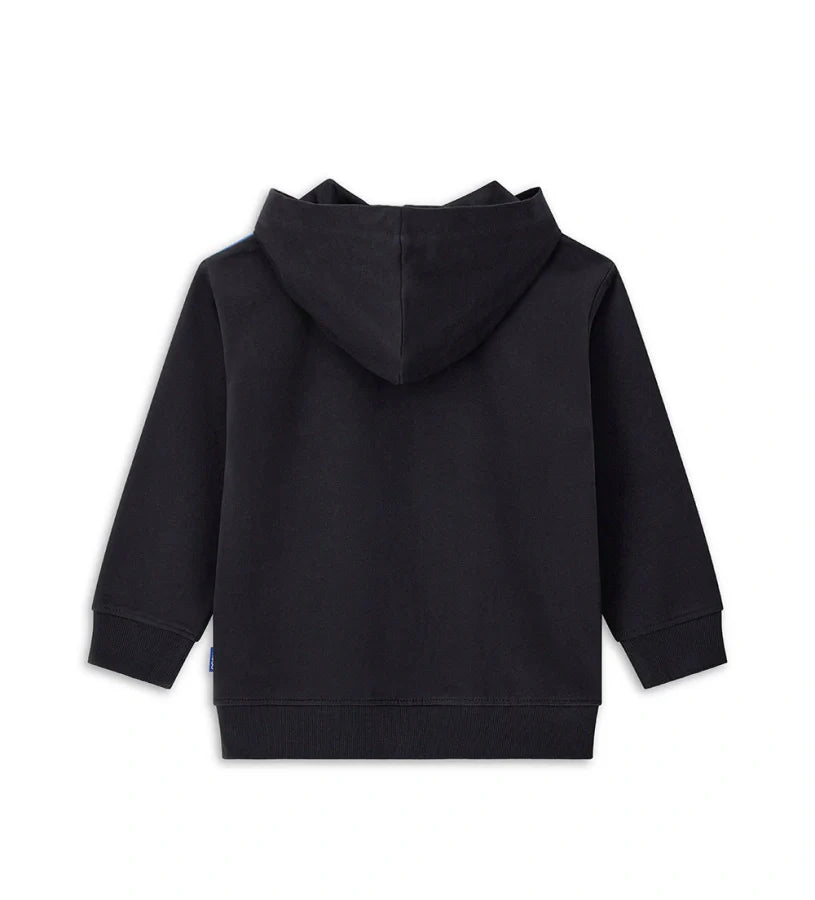 Cotton sweatshirt with hood, zip, ribbed trims, kangaroo pocket, prints on the front, back and sleeves.
