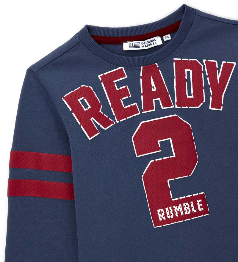 Long-sleeved cotton T-shirt with round neck, ribbed finish, prints on the front and sleeves.