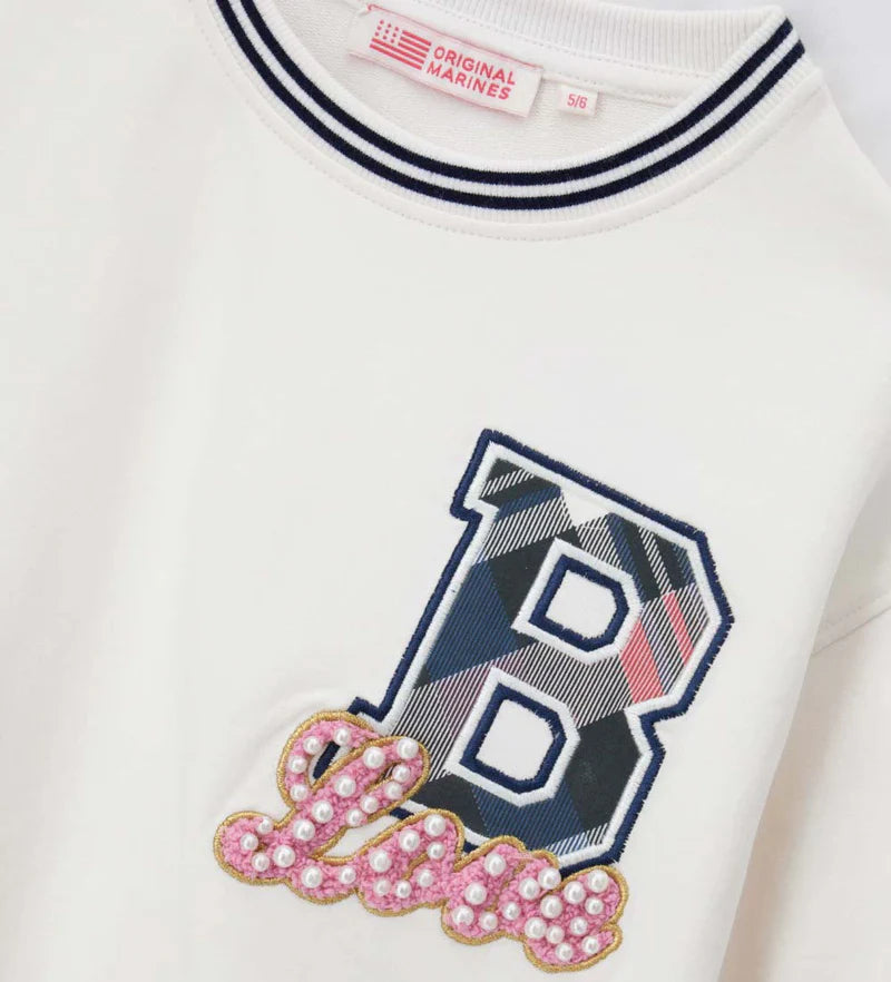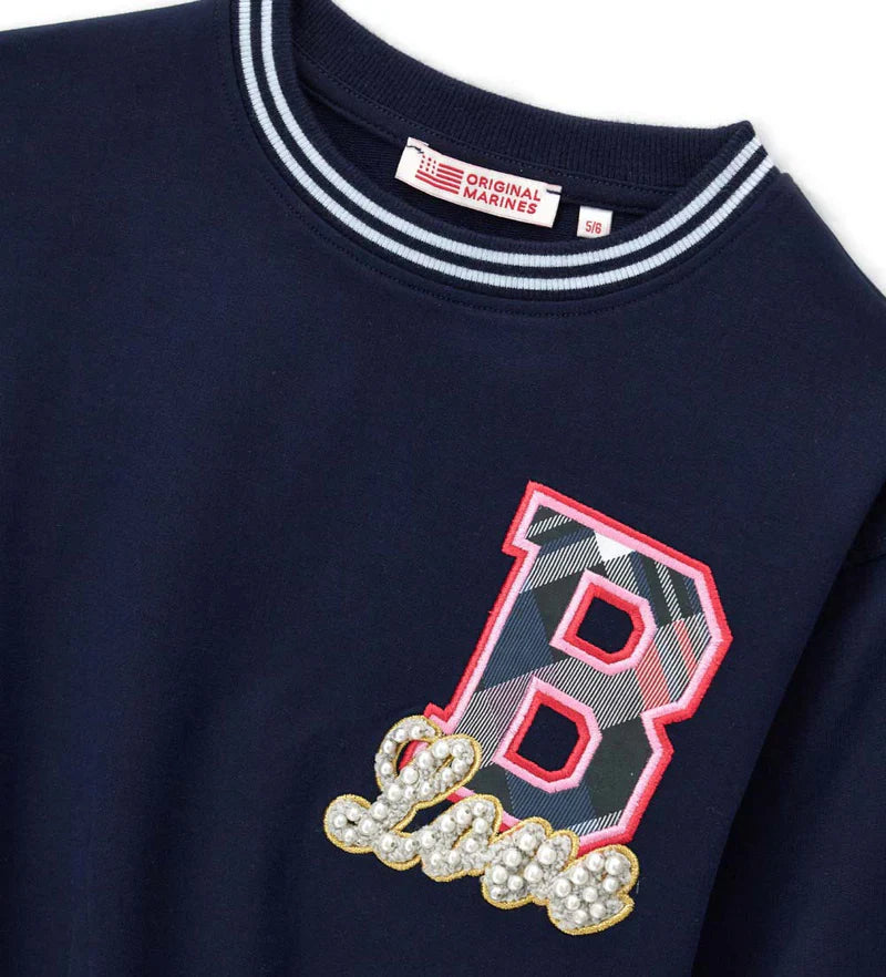Stretch cotton sweatshirt with round neck, long sleeves, ribbed trims, balloon hem and sequins.