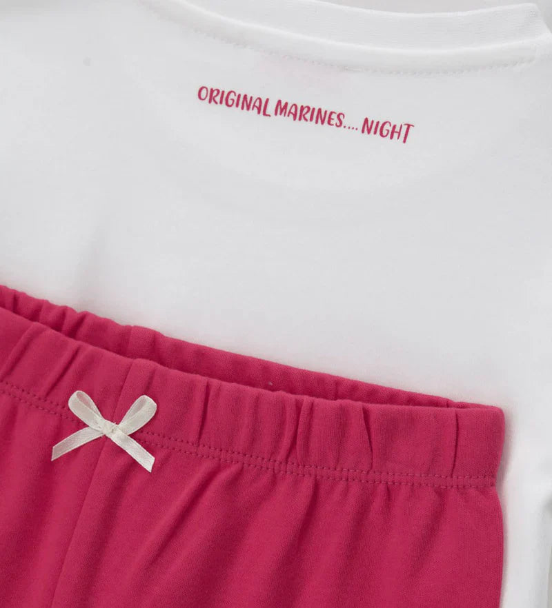 Warm cotton pyjamas: round neck t-shirt with photographic print and matching trousers with bow.