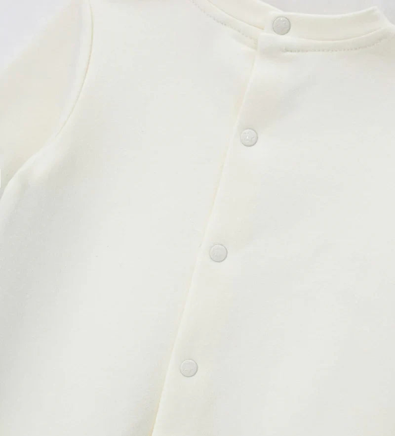 Chenille romper with round neck, long sleeves, snap button opening at the back and inside of the legs.