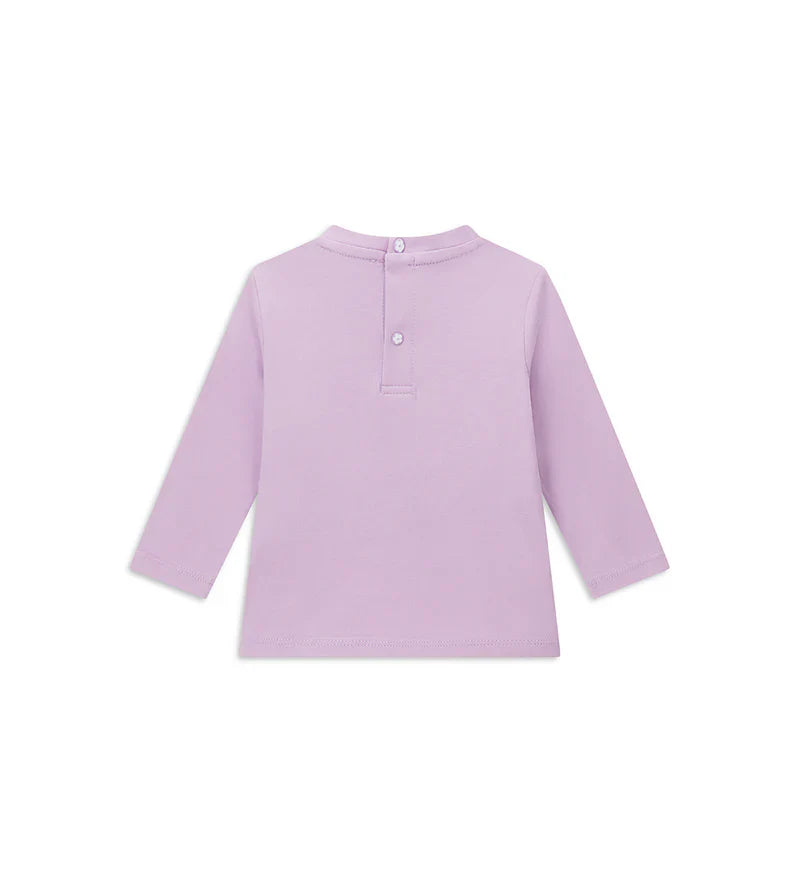 Cotton T-shirt with round neck, long sleeves, snap button opening at the back, print and embroidery at the front.