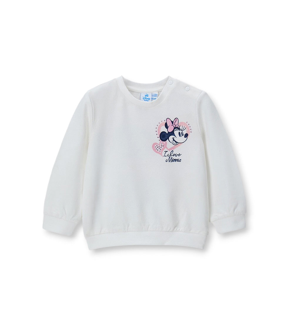 White Disney sweatshirt for girls with crew neck, Minnie Mouse print on the front and glitter and rhinestone details on the back.